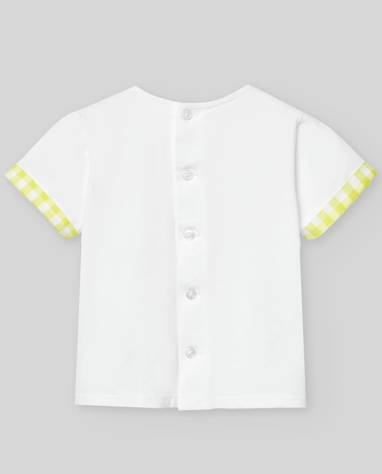 Camiseta de manga corta para niña con volantes en los hombros y lazos de cuadros vichy azul. Presenta un estampado de oca con flores, de la colección «Anade».