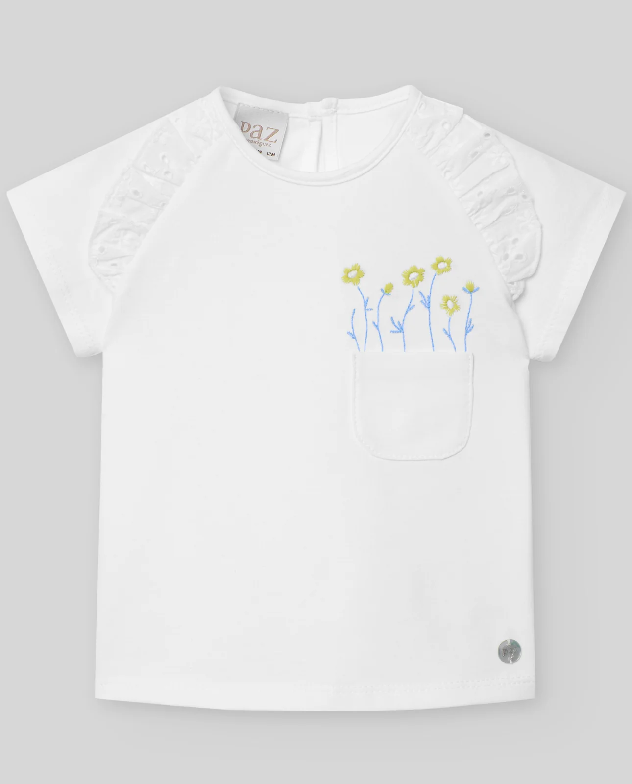Camiseta de jersey niña con bolsillo y bordado flores.