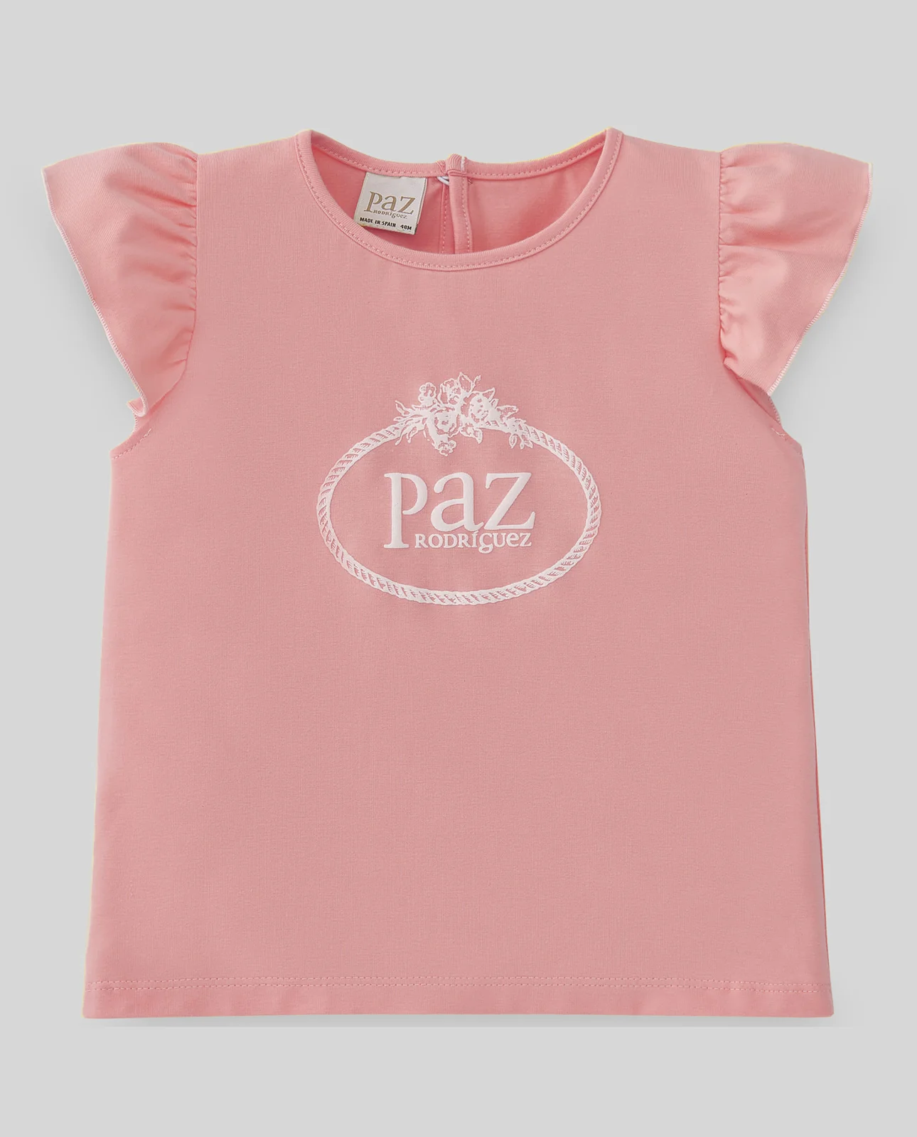 Camiseta para niña de cuello redondo sin mangas, con remate de volantes. Escudo estampado en el delantero con relieve. Cierre trasero con botón lágrima.