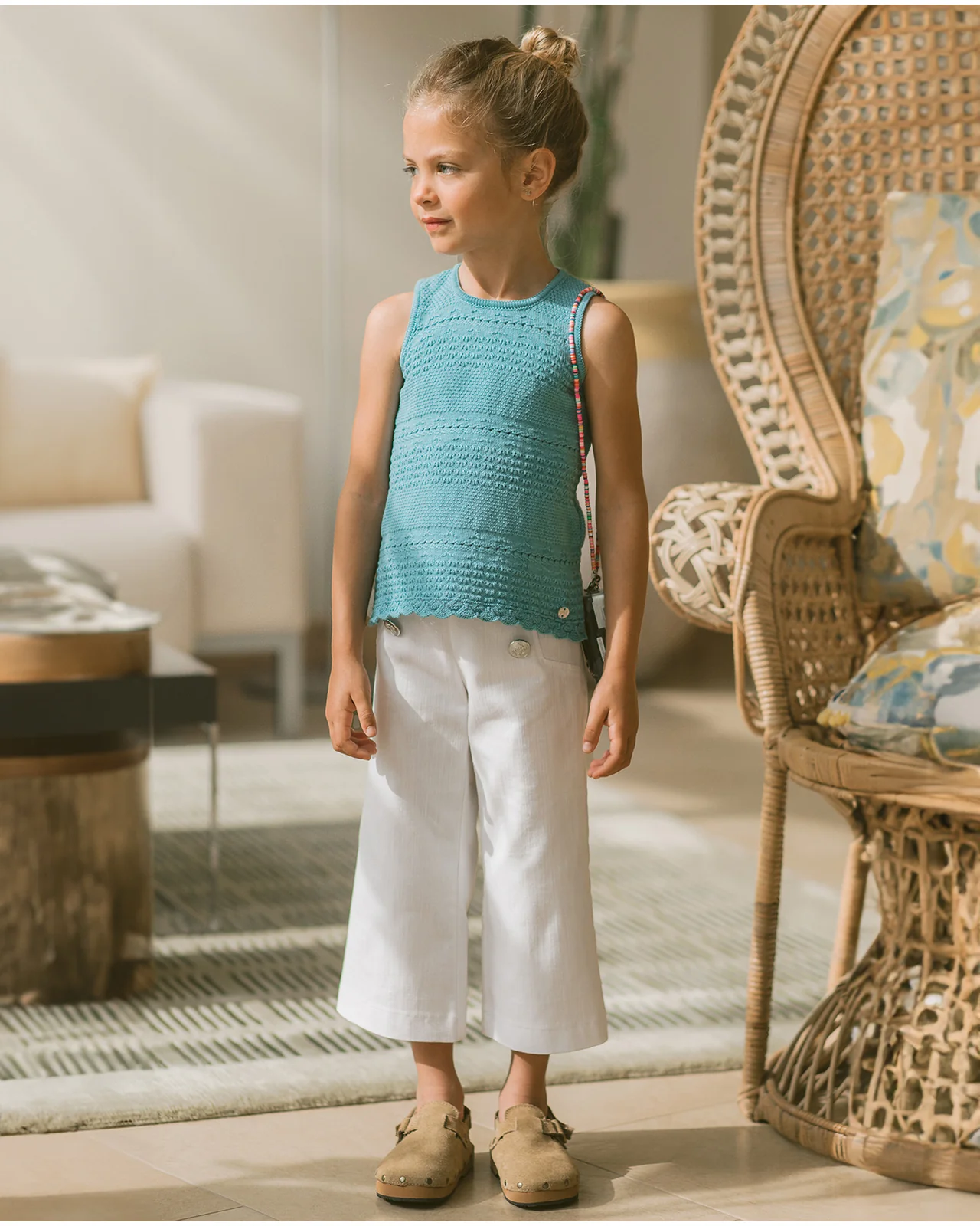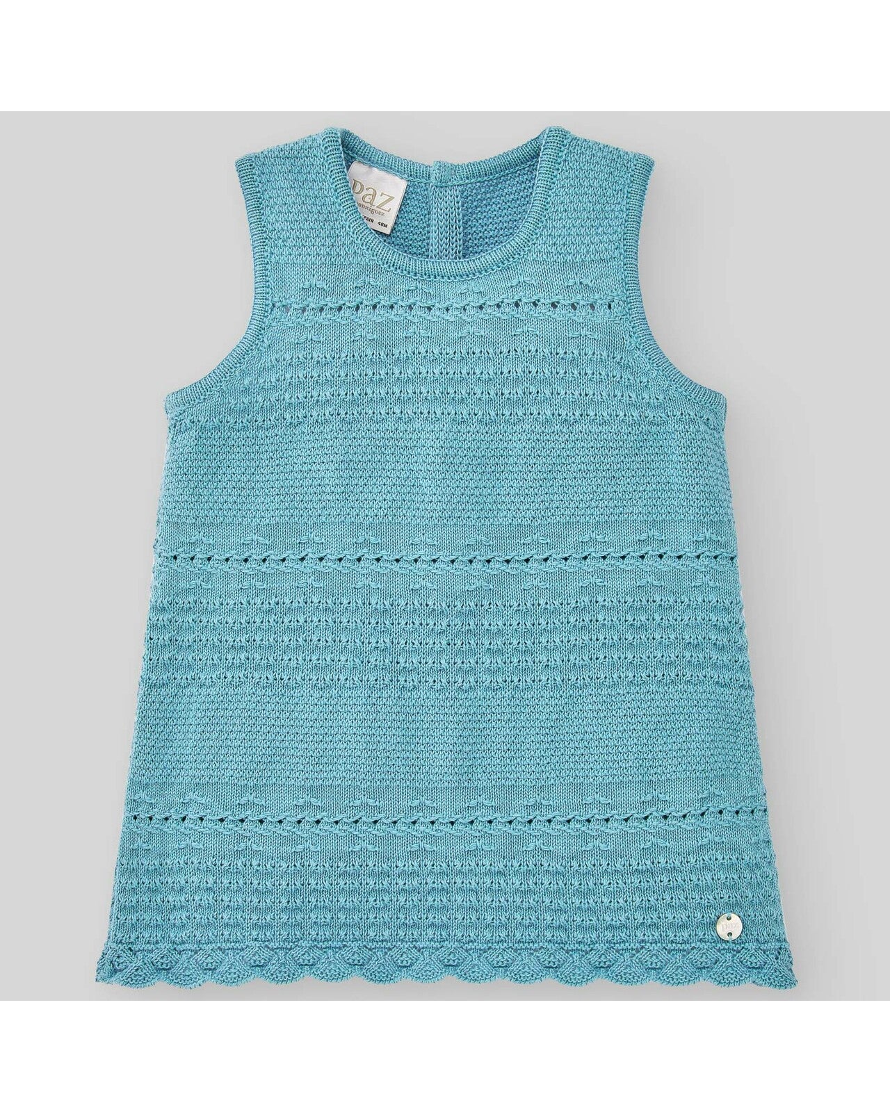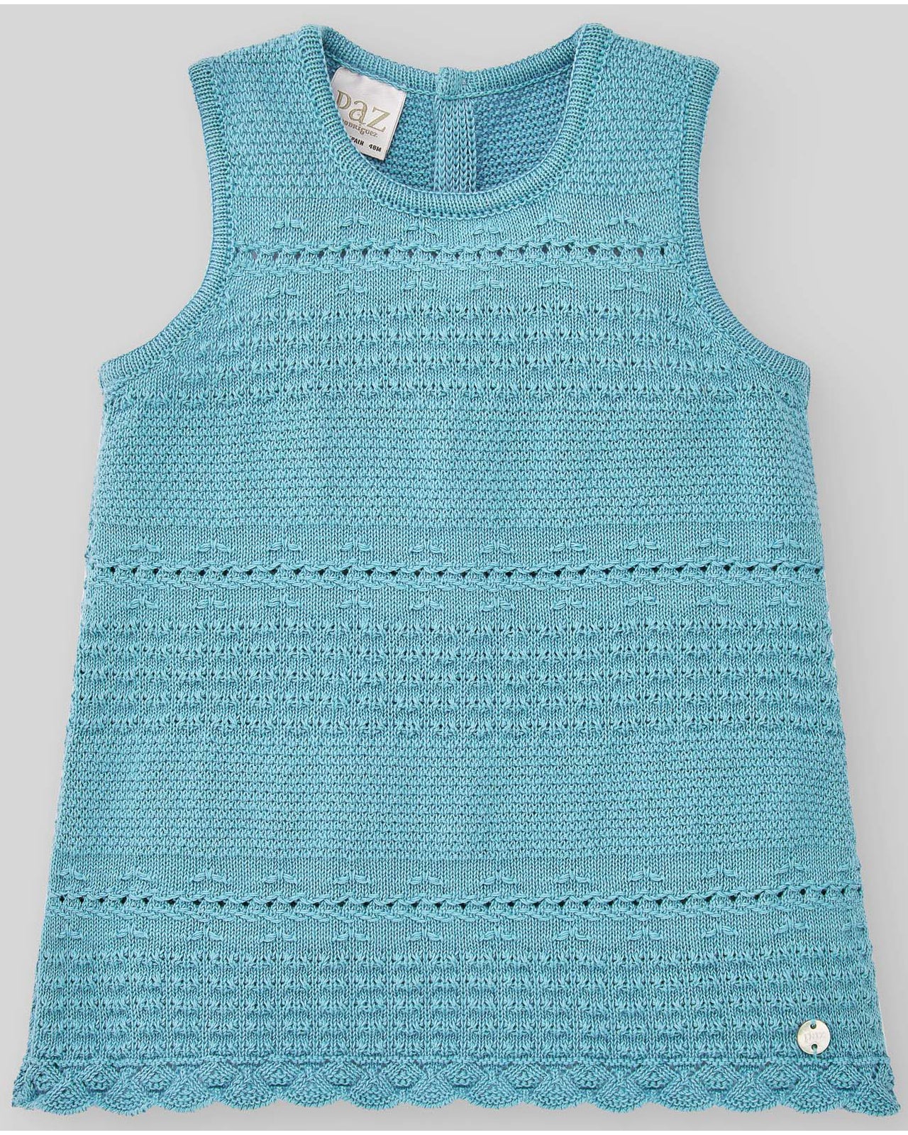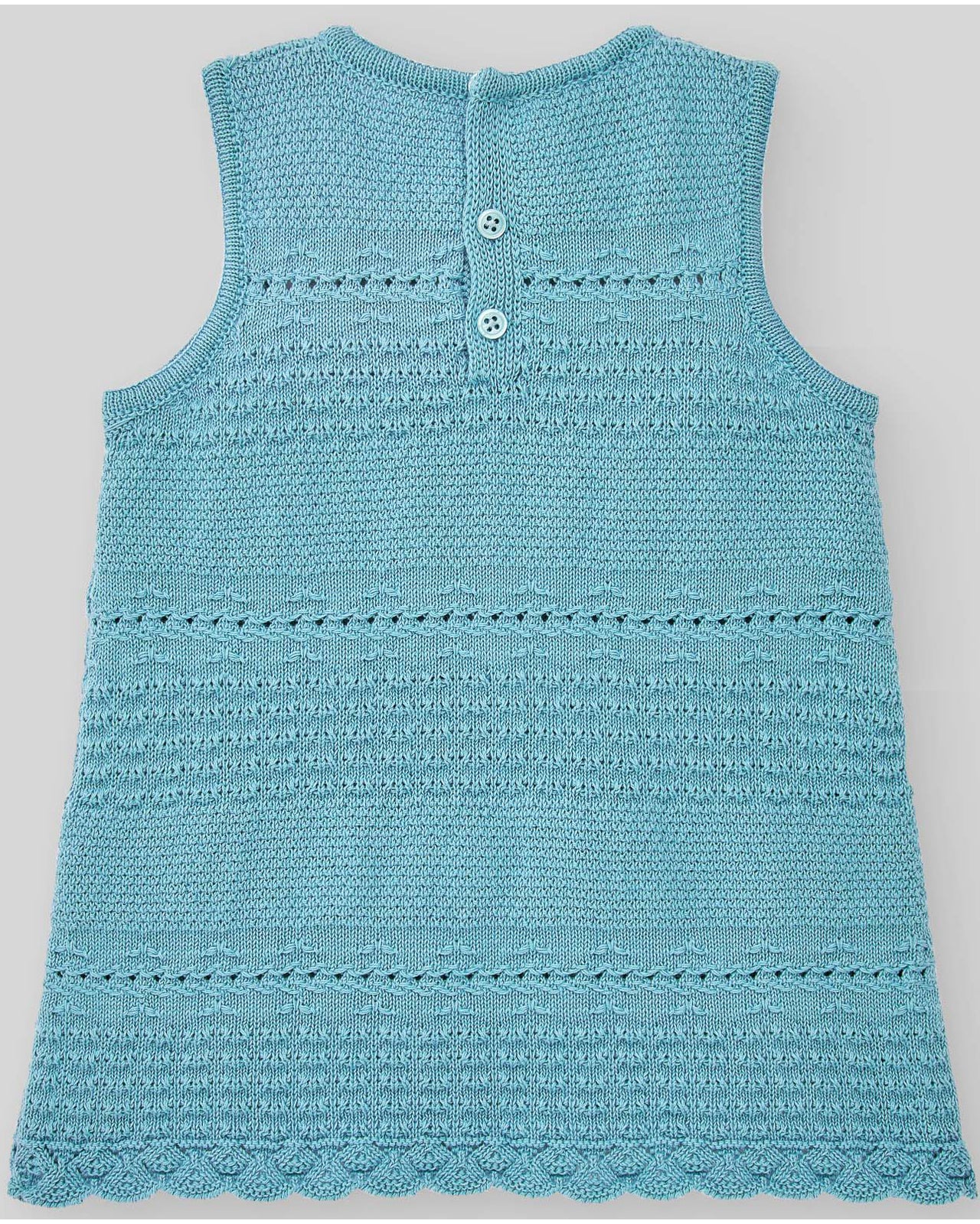 Top de punto con cuello redondo y sin mangas. Cierre trasero con botones a tono. Remate en ondas.