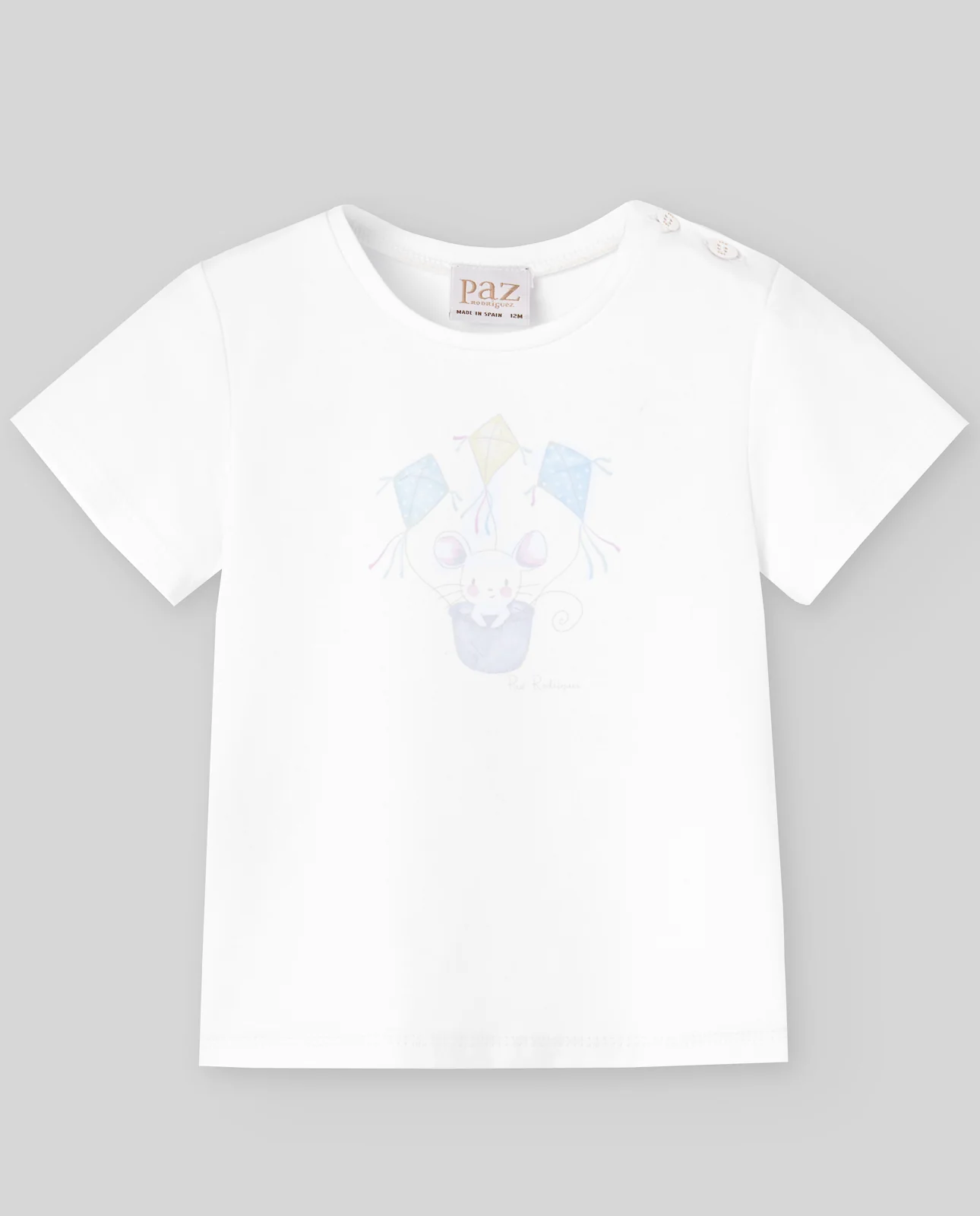Camiseta de manga corta, para niño con dibujo de ratón central. Abertura en hombro con botones y tejido ligeramente elástico para mayor confort.