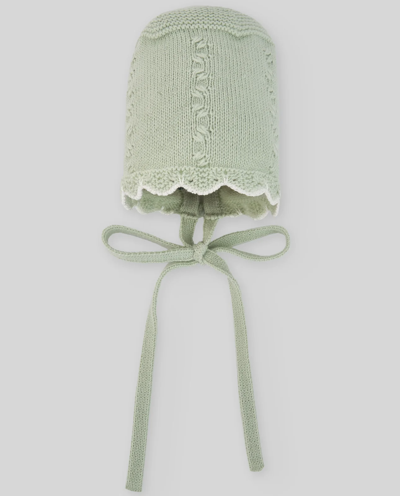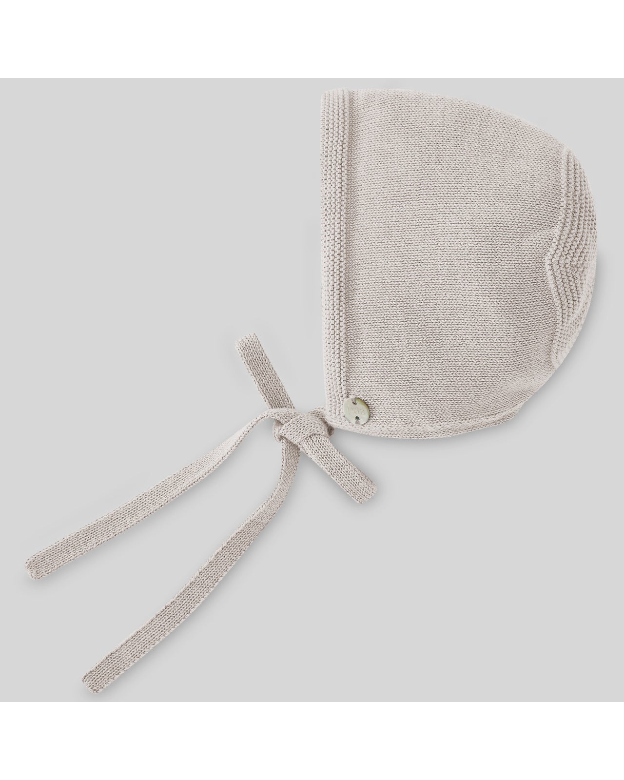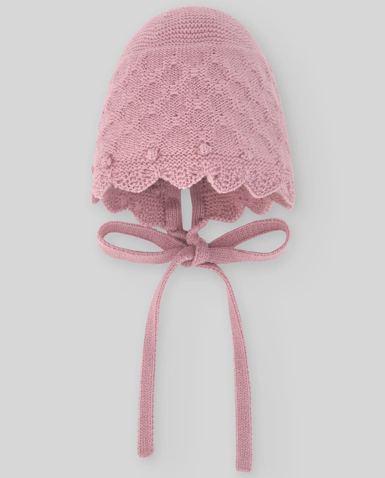 Capota de punto para bebé niña. Remate de ondas y dibujo con bodoques a tono. Lazada en punto para mayor ajuste y confort. Ideal para coordinar con las prendas de la misma colección.