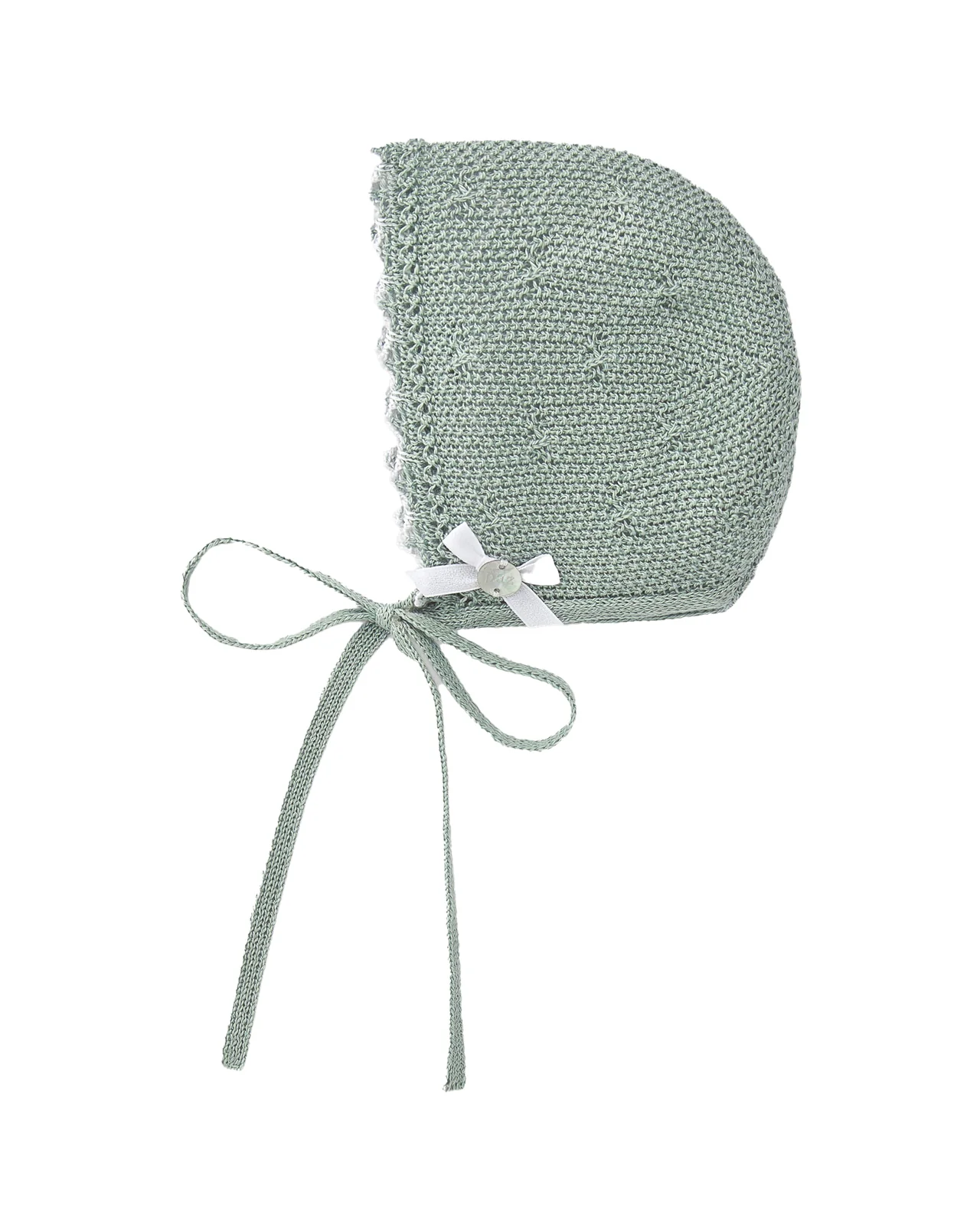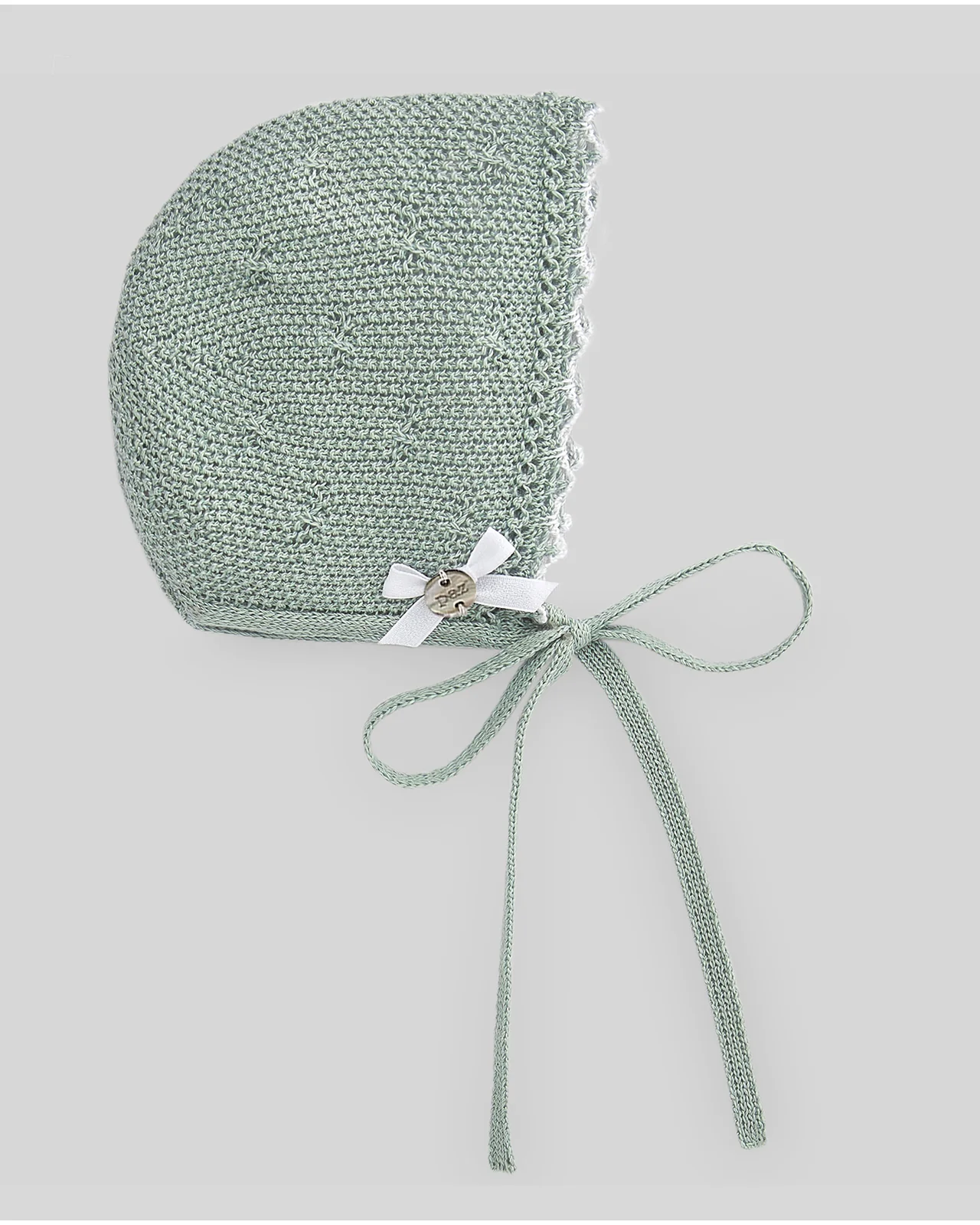 Capota en punto algodón para bebé niña, con remate de ondas. Cierra con cordón de punto a tono, para mayor ajuste. Lacito en un lado con placa de nácar PAZ.