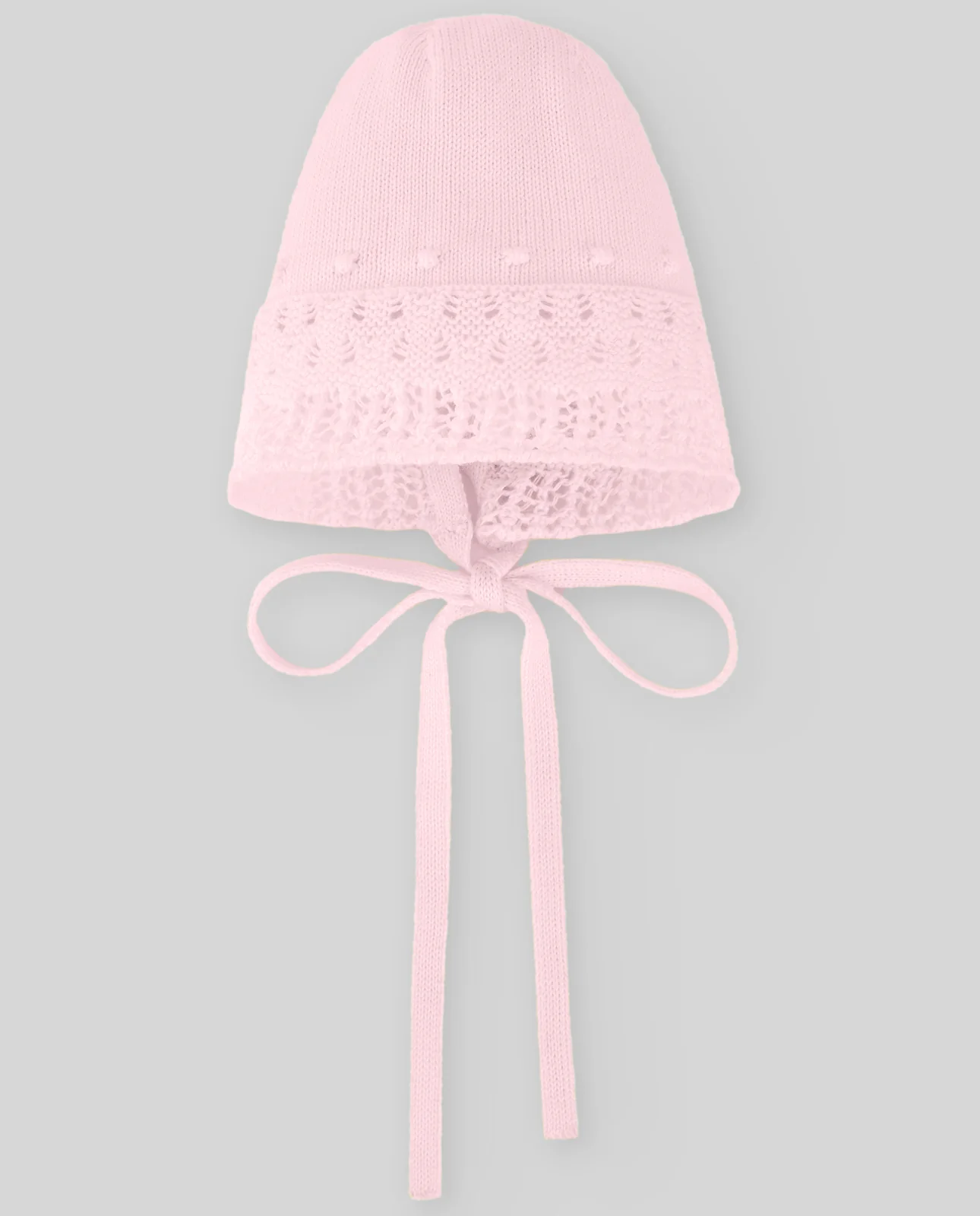 Capota de punto para bebé niña, con dibujos calados y lazo a contraste con chapa de nácar. Cordones ajustables. Combinable con la colección BICO.