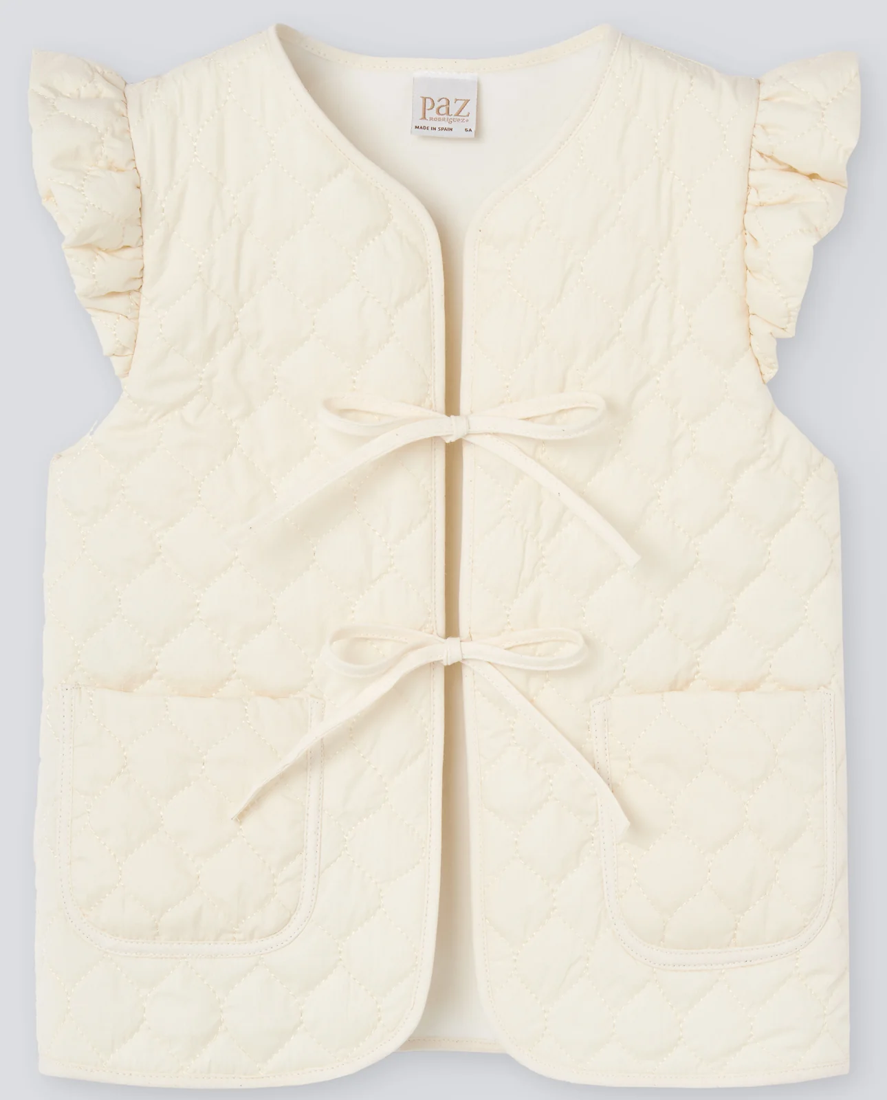 Chaleco acolchado en tono crudo con lazos decorativos en el delantero y volantes en los hombros. Una prenda ligera y abrigada ideal para superponer sobre vestidos o camisetas, añadiendo un toque coqueto a cualquier conjunto.