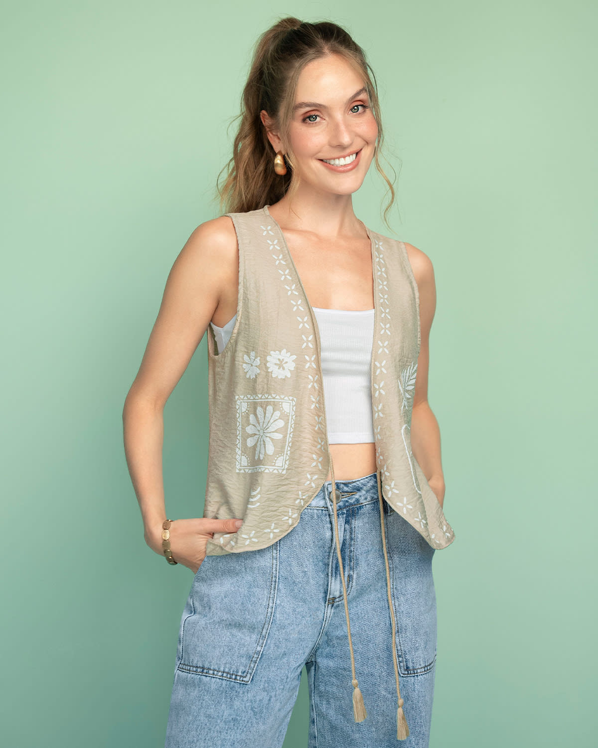 ¡Agrega a tus looks el complemento que siempre has querido con este chaleco manga sisa con tira para anudar! Es una prenda soñada que lleva tus outfits a otro nivel. Está elaborado en tela tipo lino, lo que lo hace ideal para los días de verano. Además tiene un detalle estampado que es tipo bordado en el frente ¡que estamos amando! Úsalo con un crop top y unos shorts tiro alto ¡y vive los días de sol con mucho estilo!