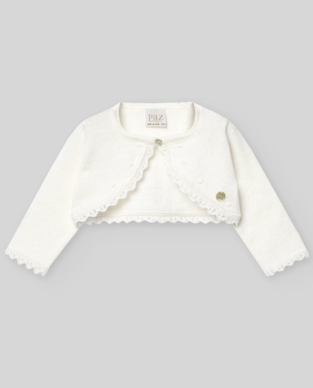Chaqueta corta de punto para niña en algodón 100%. Con diseño especial de ceremonia, cierre con botón y delicados calados en el filo. Ideal para eventos primaverales y primeras puestas.