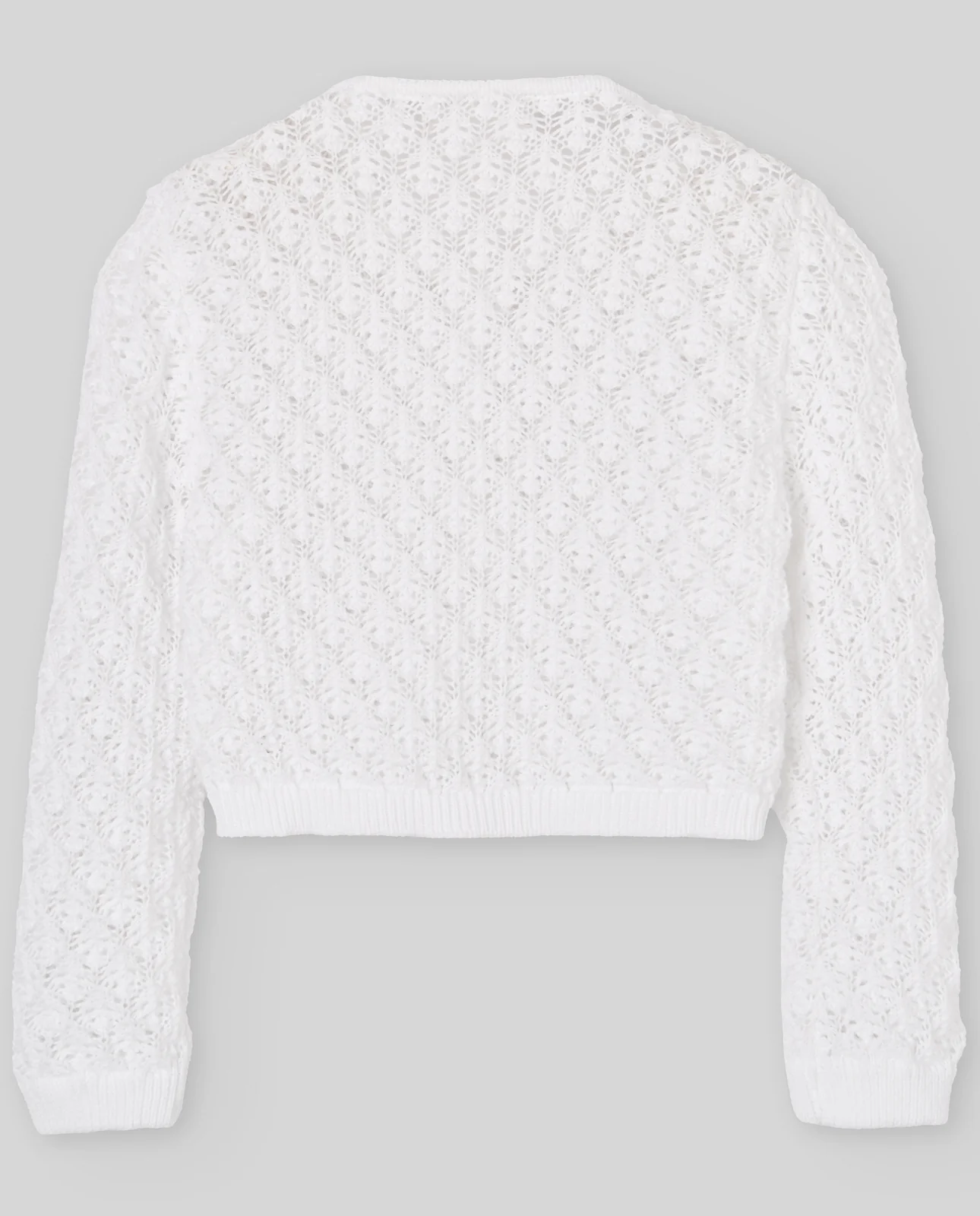 Chaqueta larga de punto para bebé recién nacido. Cierre frontal con dos botones y placa decorativa PAZ Rodríguez.