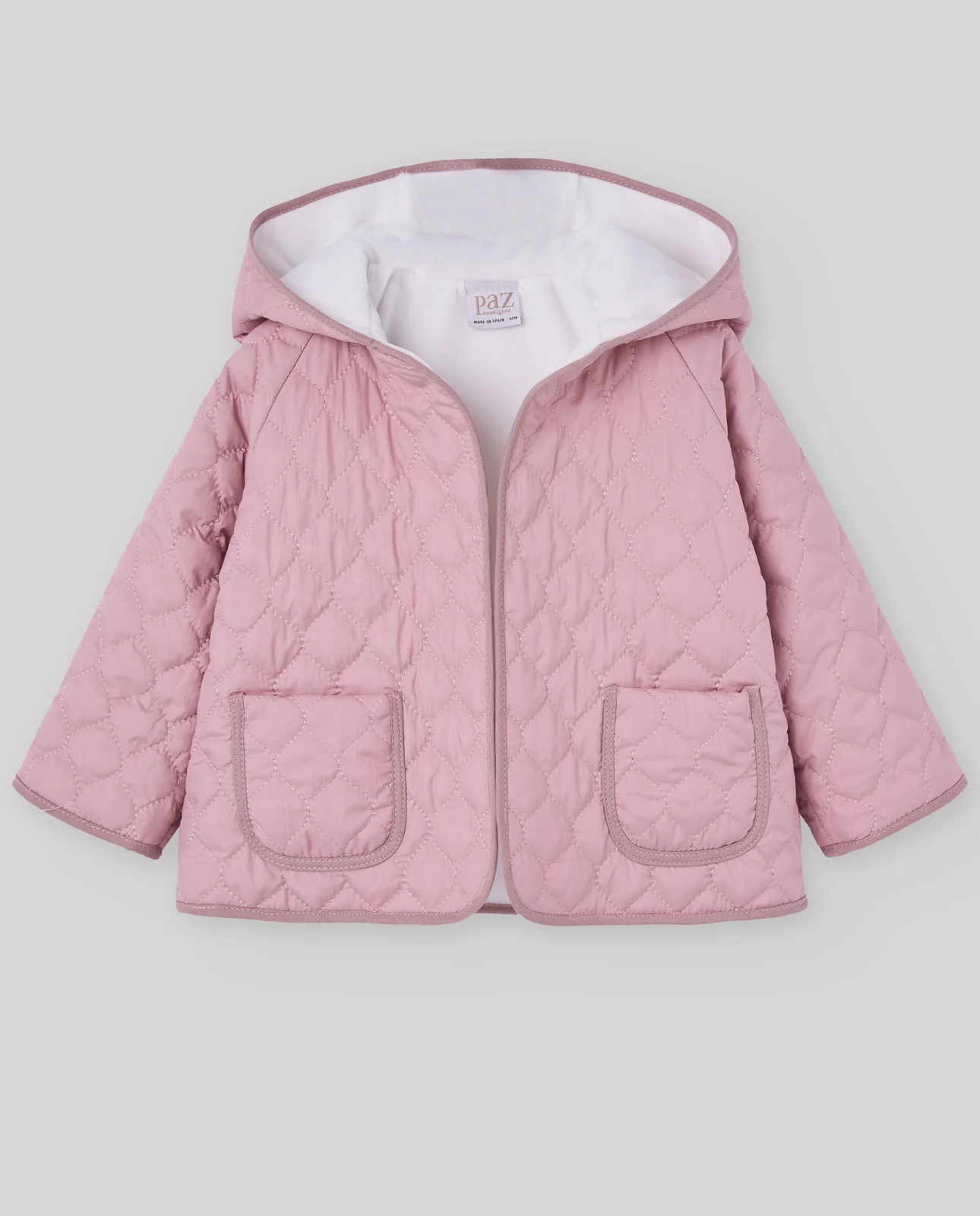 Chaquetón acolchado con capucha, en tejido impermeable estampado, ideal para la lluvia, con cierre frontal y bolsillos prácticos.