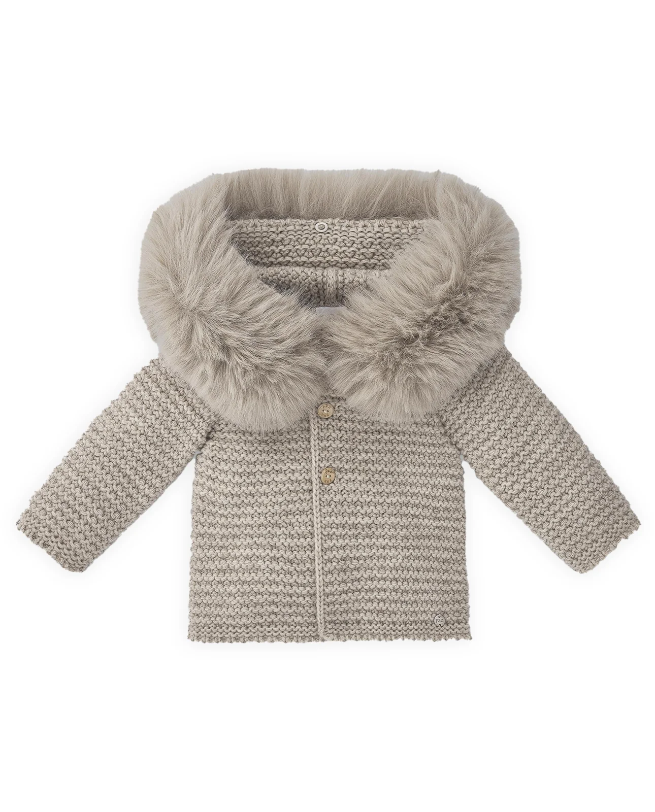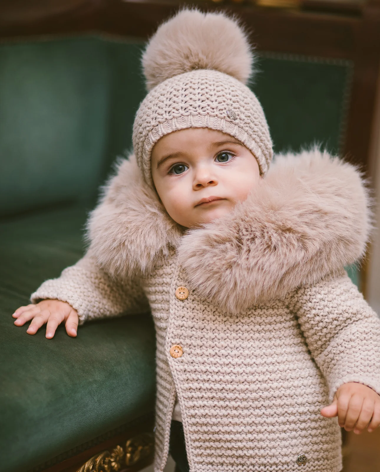 Chaquetón de punto con detalles de pelo sintético en puños y bolsillos, forro interior cálido y capucha envolvente, ideal para el invierno.