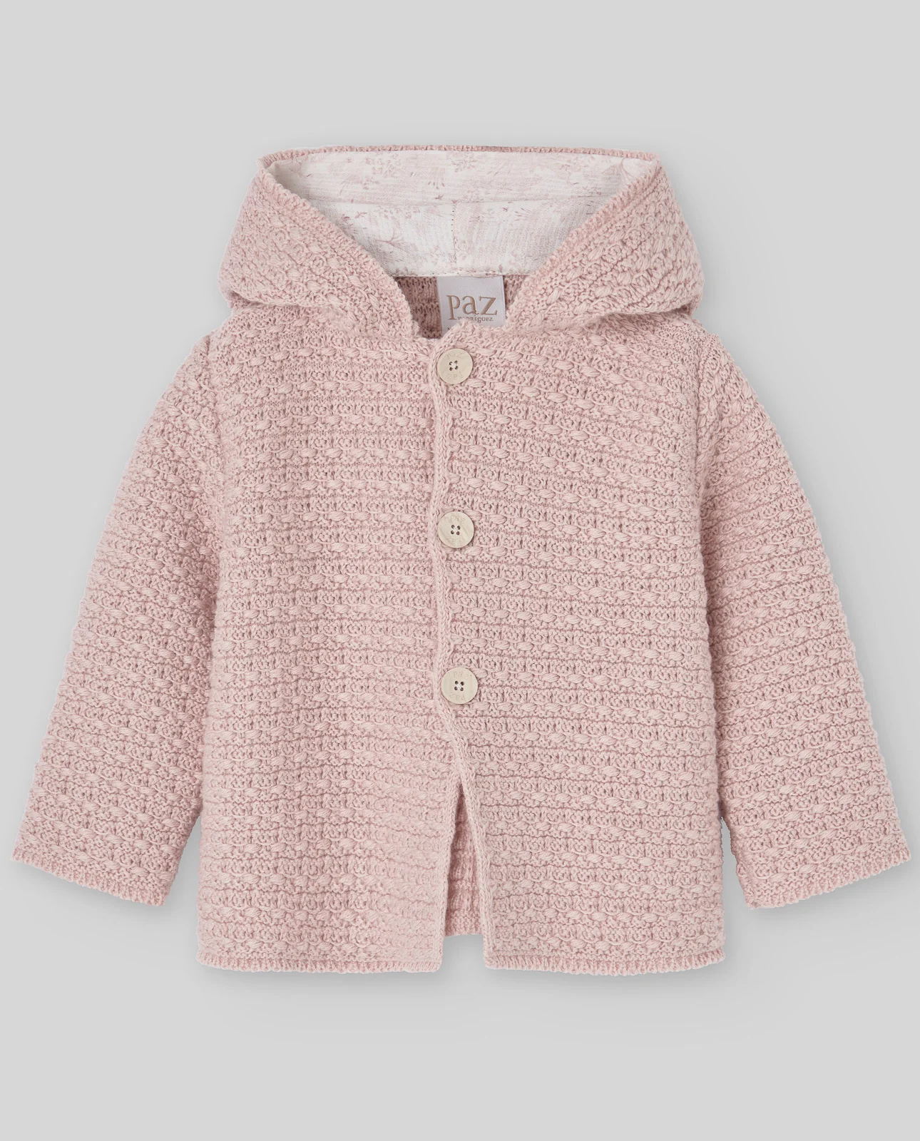 Chaquetón de punto unisex, confeccionado en algodón y cashmere con cierre delantero con botones. Capucha en pico con detalle de pompón, forrada con tejido bordado de estrellas.