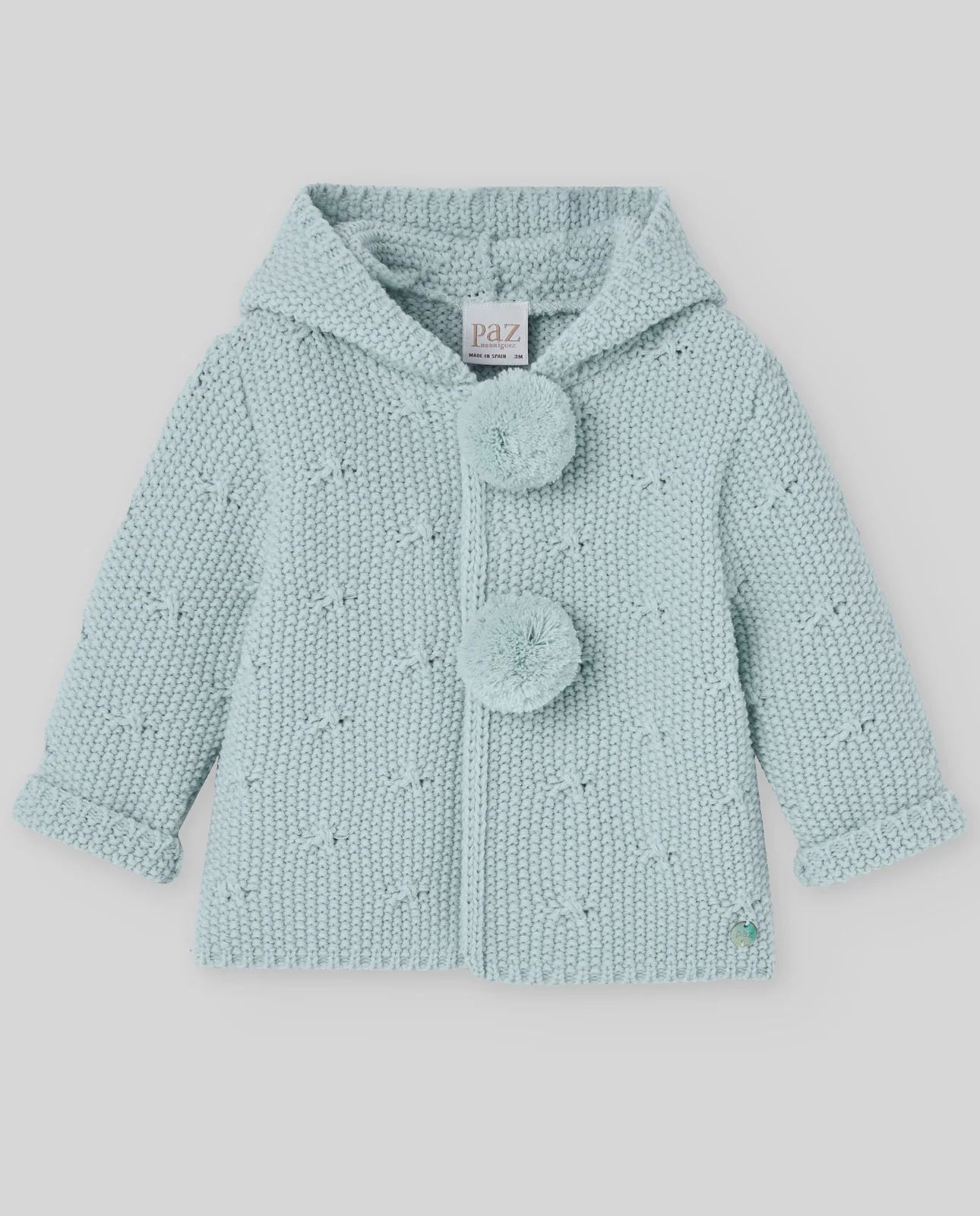 Chaquetón de punto con capucha y pompones decorativos con tejido tipo semilla.