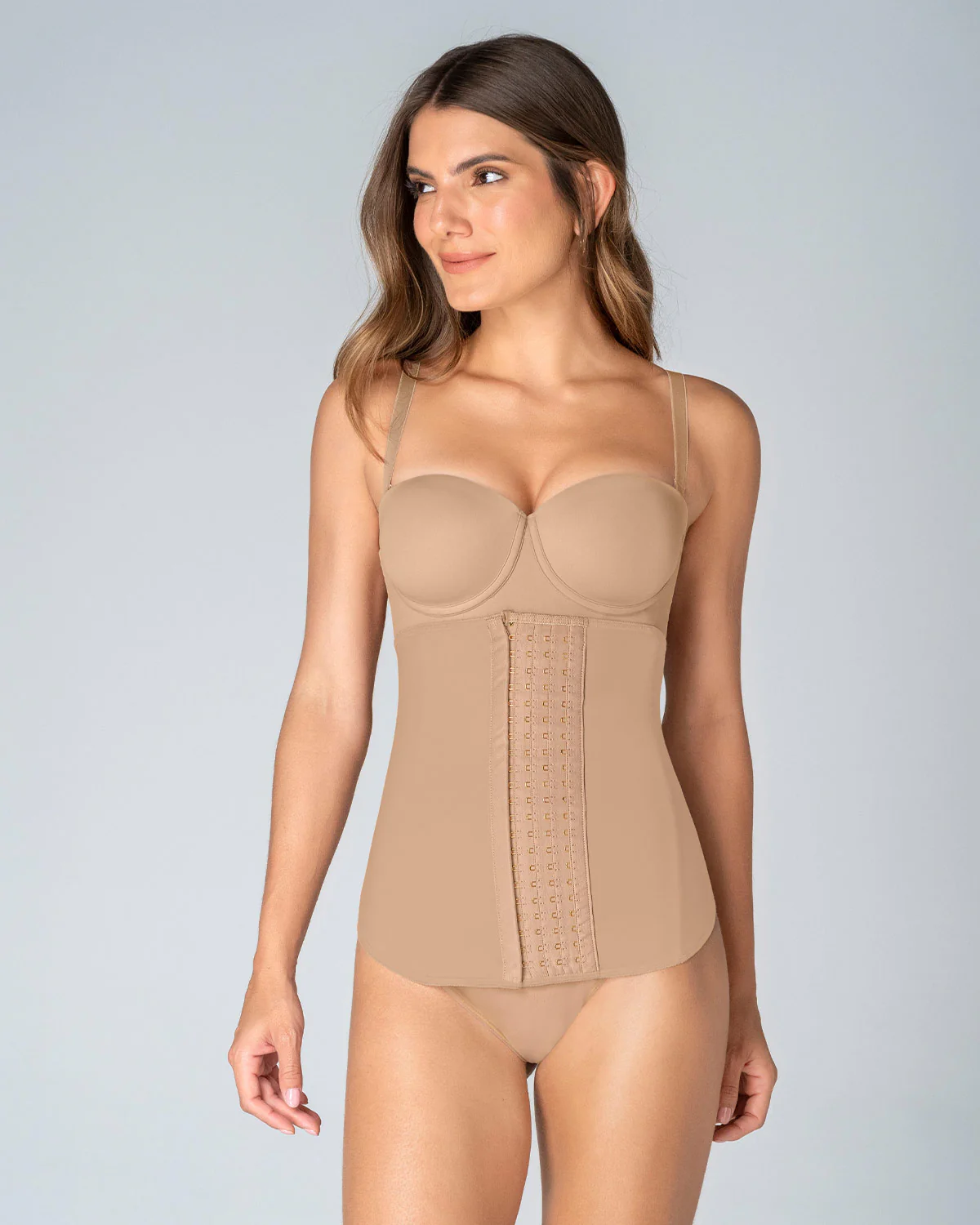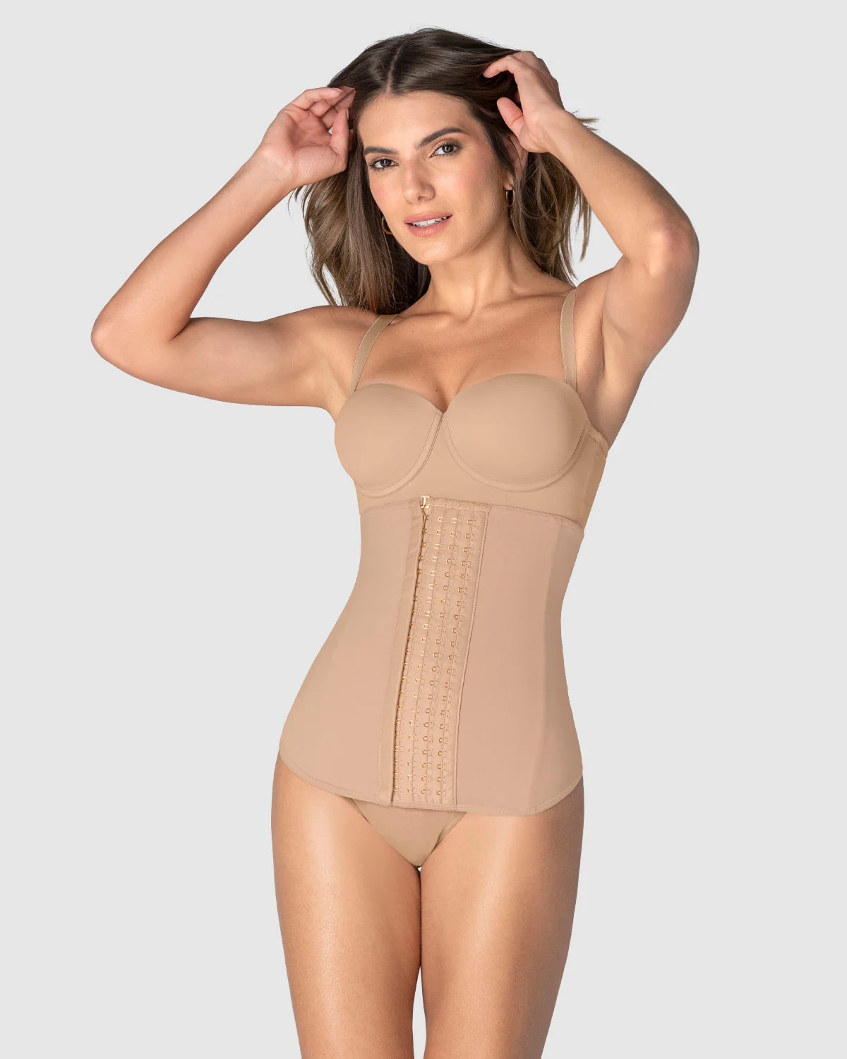 ¿Una cintura más definida en solo instantes? ¡a muchas nos encantaría! Por eso diseñamos esta faja que cubre justo esas zonas que más te gustaría estilizar como el abdomen y la espalda. Cuenta con 5 varillas internas distribuidas así: 2 en el frente y 3 en la espalda. Estas varillas son muy suaves y flexibles, y están protegidas por una capa de tela muy suave con la piel, y lo que hacen es brindar más sujeción para realzar tus curvas y definir aun más tu cintura. En la parte interna cuenta con una capa de nuestro material de compresión PowerSlim y en la parte externa con una capa muy suave de tela lisa. Su abrochadura cuenta con 4 niveles de ajuste y un broche superior de seguridad para que no se abra. En la espalda es más angosta que en el frente para que no quede sobre tus glúteos si no justo donde termina la espalda.