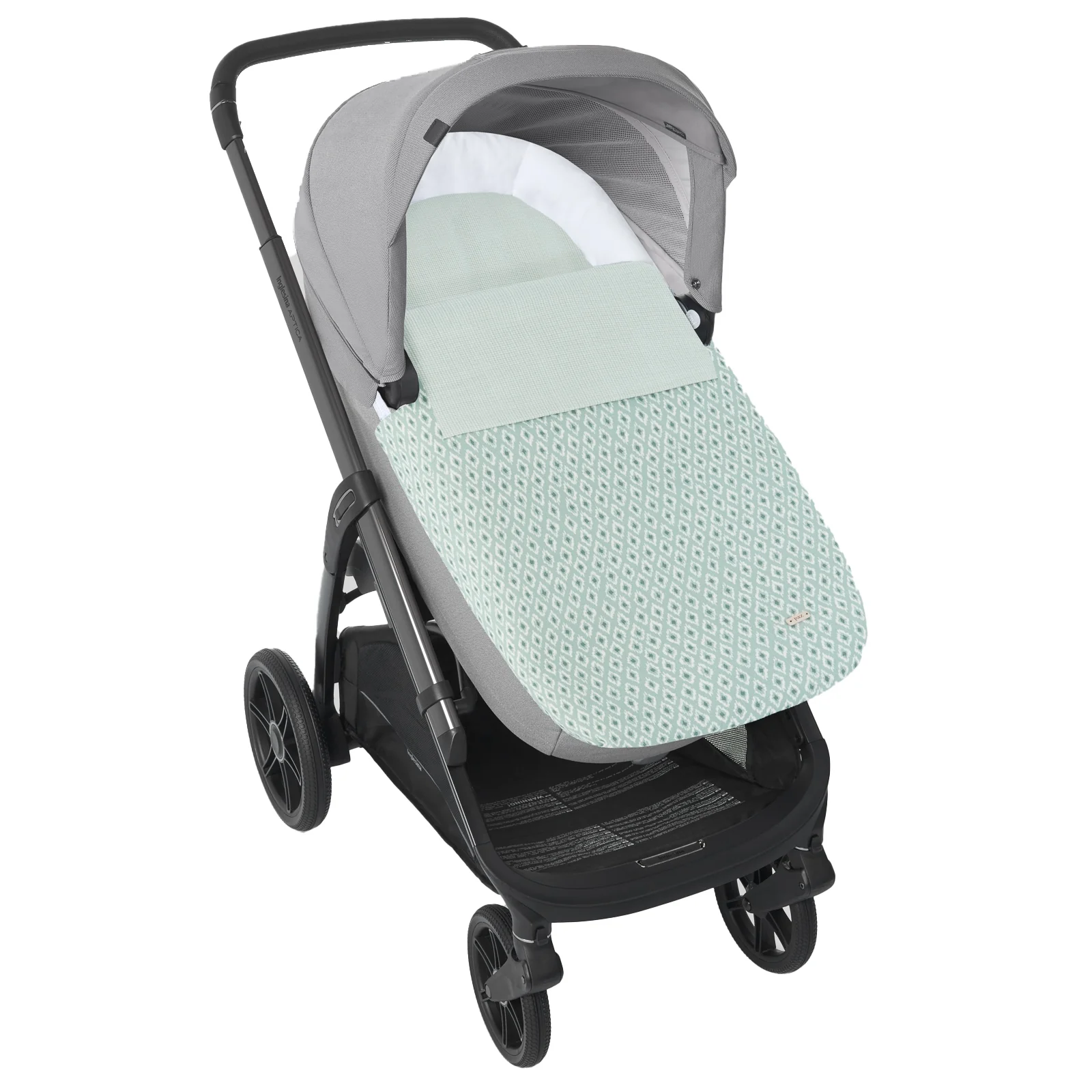 Colcha para capazo ajustable y reversible de piqué galleta jaspeado combinado con estampado de tortugas carey. Lleva un elástico en la parte inferior y se adapta a casi todos los capazos del mercado.
