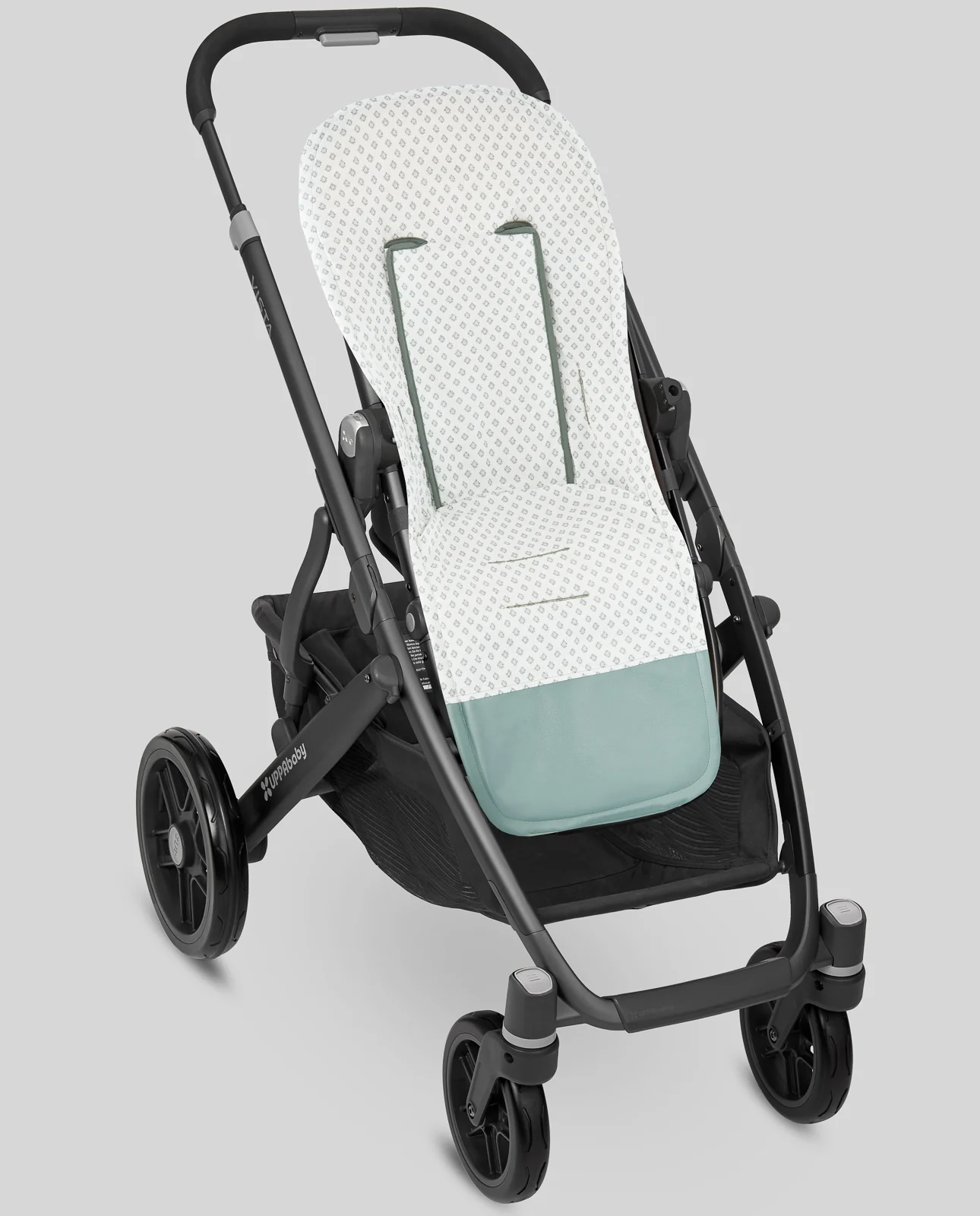 Colchoneta estrecha para sillas ligeras o de formato estrecho confeccionada en tejido loneta de estampado geométrico zigzag. Refuerzo de polipiel en los pies.