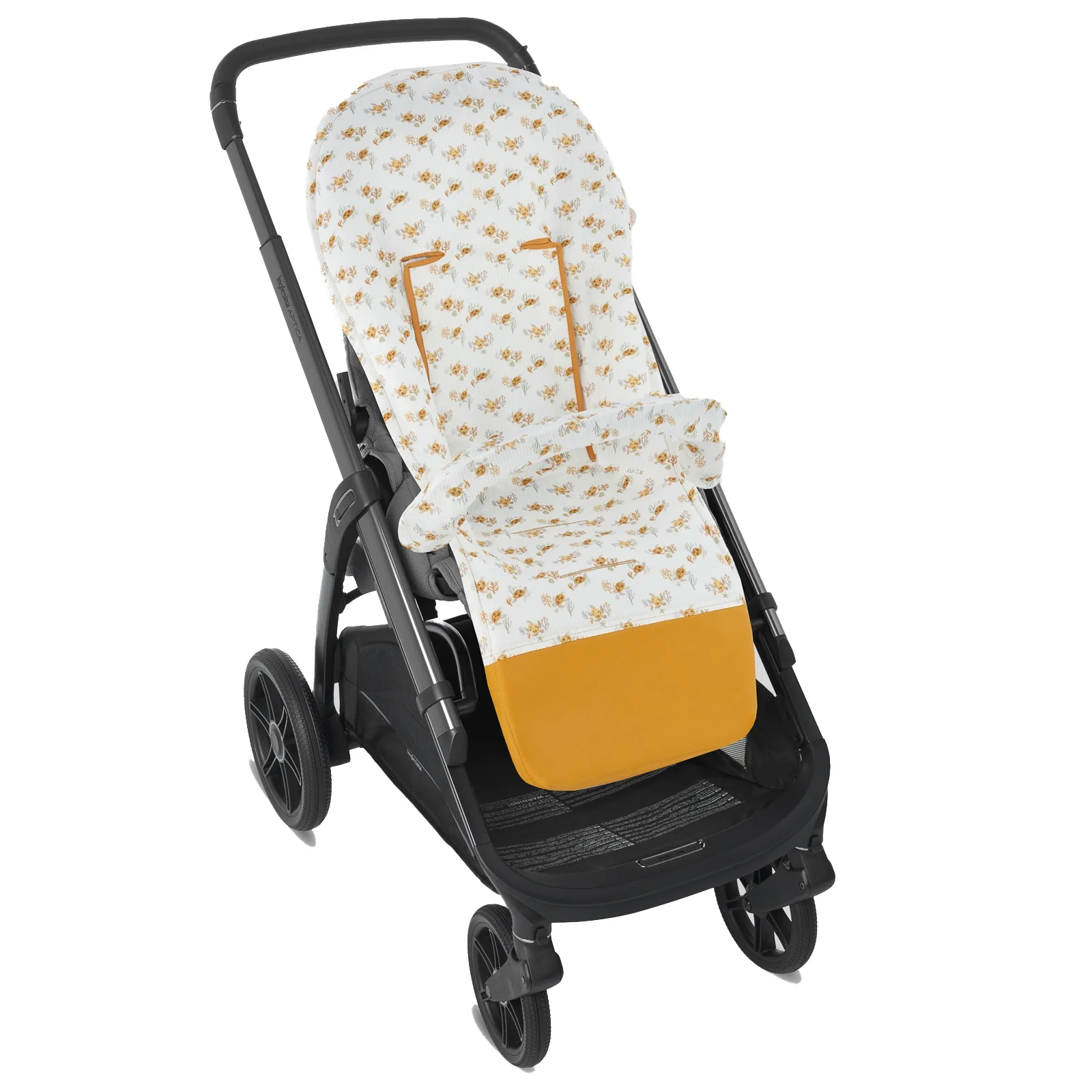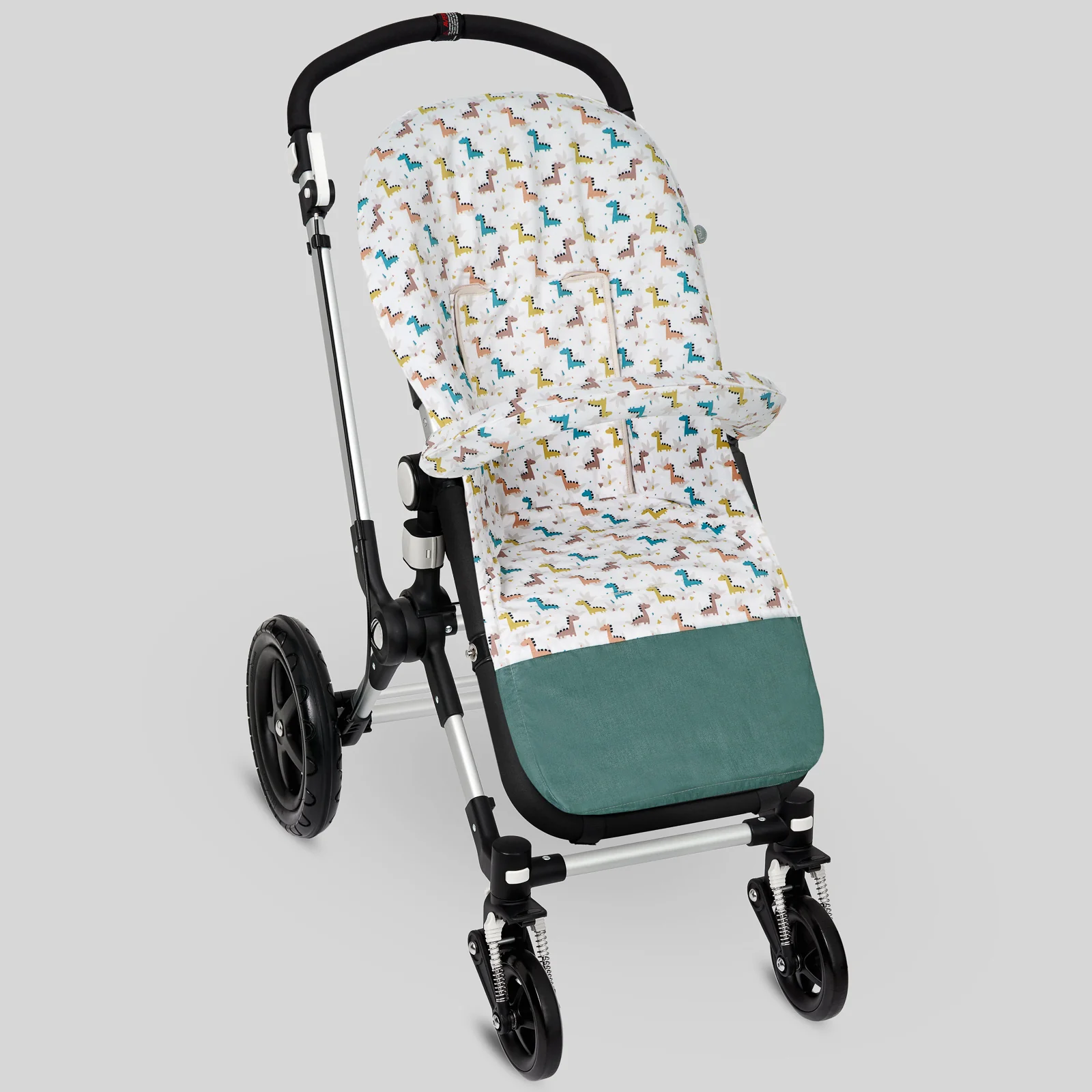 Colchoneta para sillas de paseo confeccionada en loneta de estampado vegetal. Cubre barra a juego y refuerzo de polipiel en los pies.