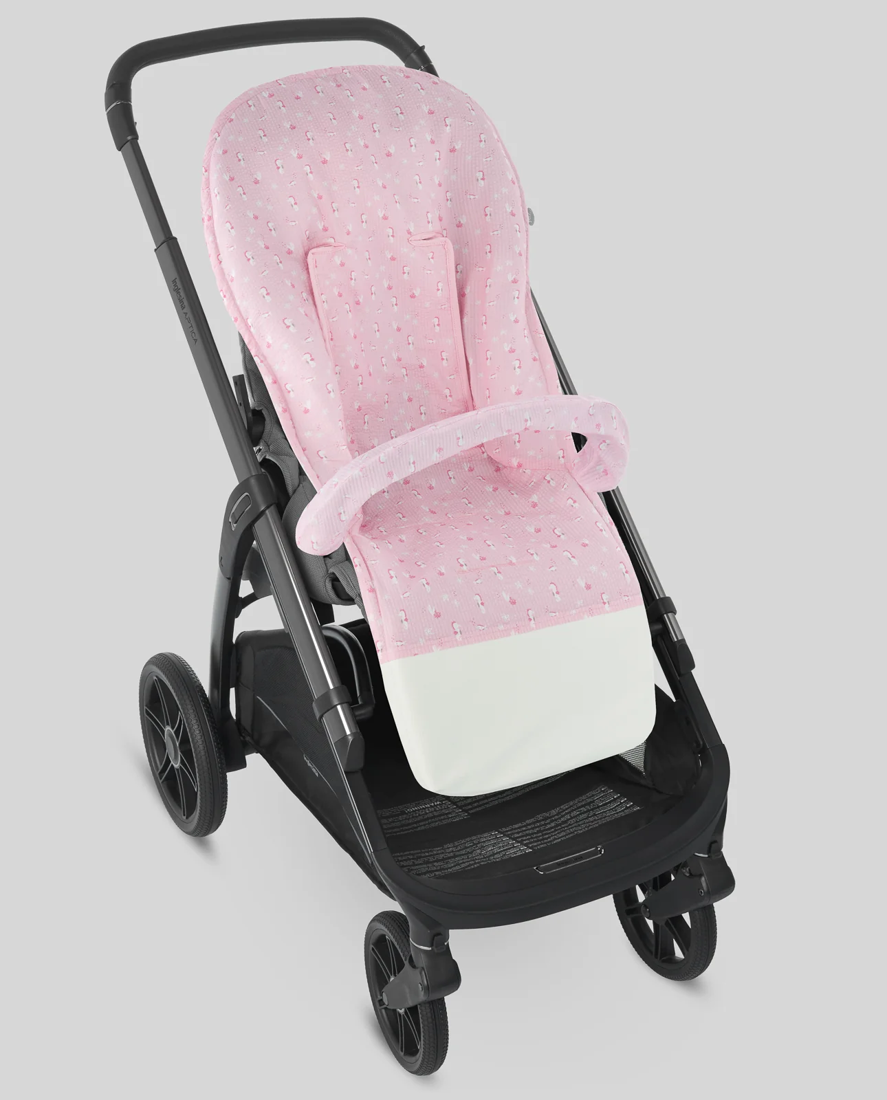Colchoneta para sillas de paseo confeccionada en bambula de estampado marino. Cubre barra a juego y refuerzo de polipiel en los pies.