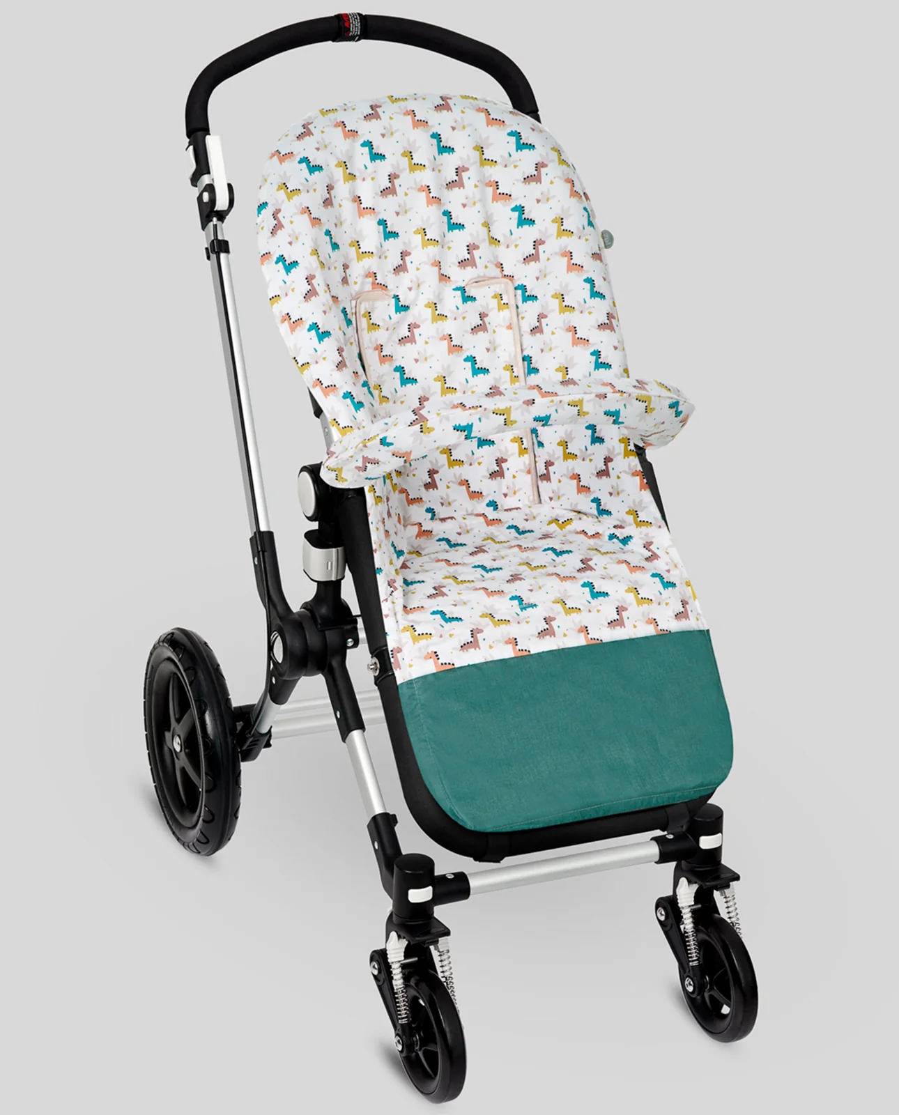 Colchoneta para sillas de paseo confeccionada en tejido popelín de algodón con estampado dinosaurios. Cubre barra a juego y refuerzo de polipiel en los pies.