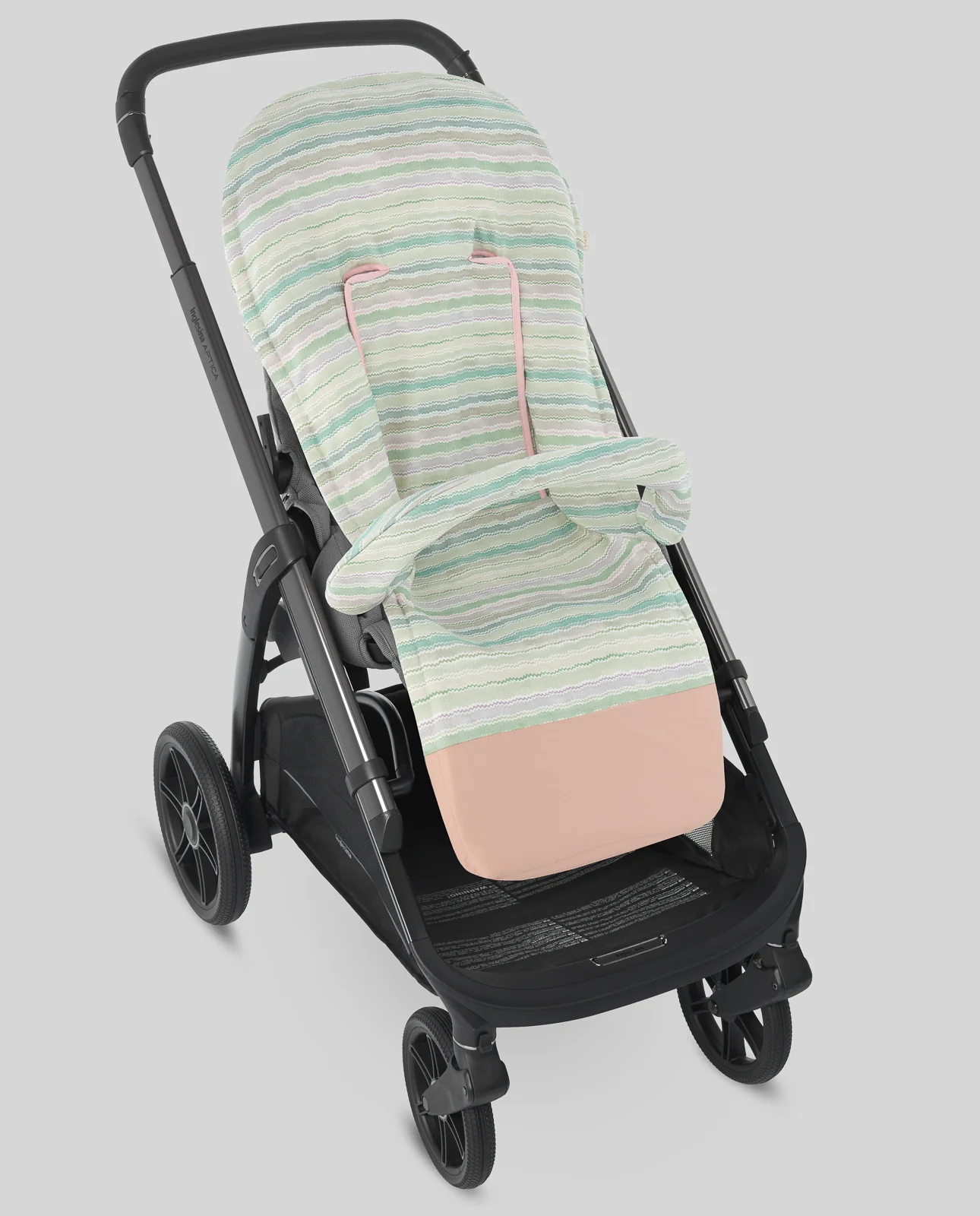 Colchoneta para sillas de paseo confeccionada en loneta de estampado geométrico zigzag. Cubre barra a juego y refuerzo de polipiel en los pies.