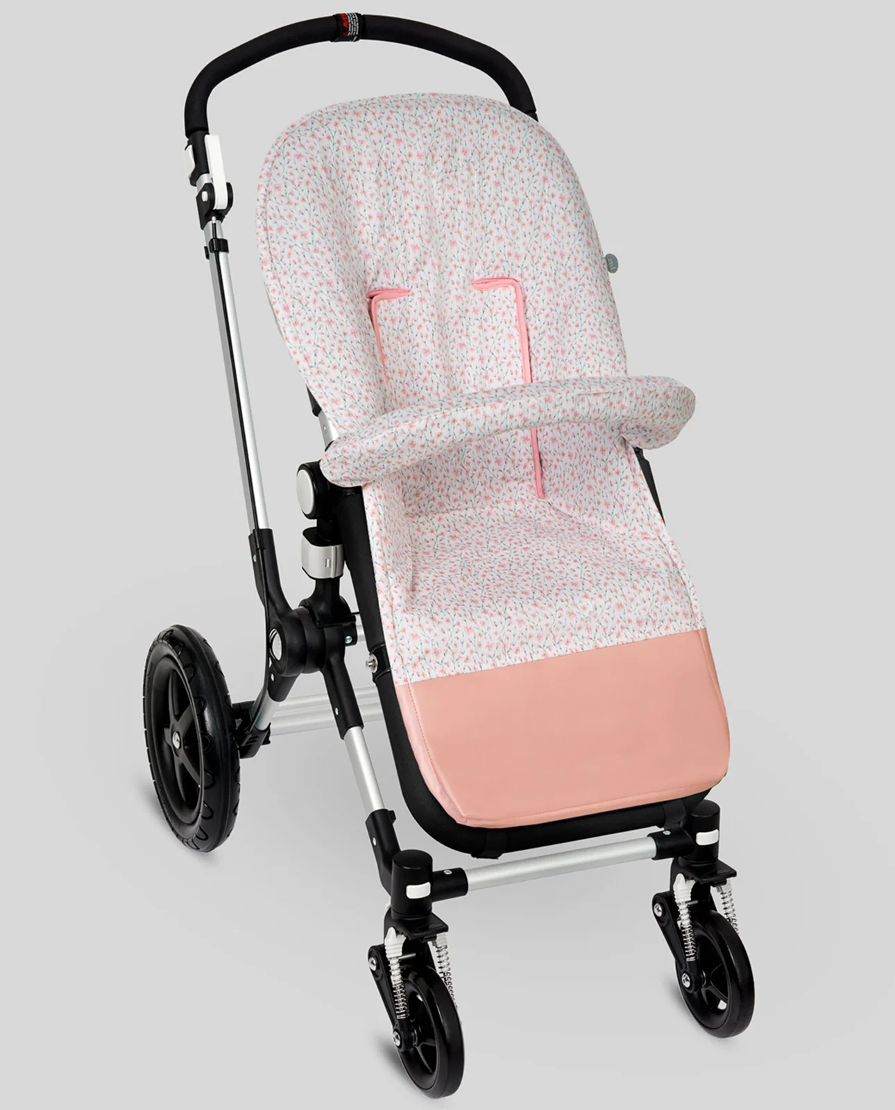 Colchoneta para sillas de paseo confeccionada en tejido otomán de algodón con estampado floral. Cubre barra a juego y refuerzo de polipiel en los pies.