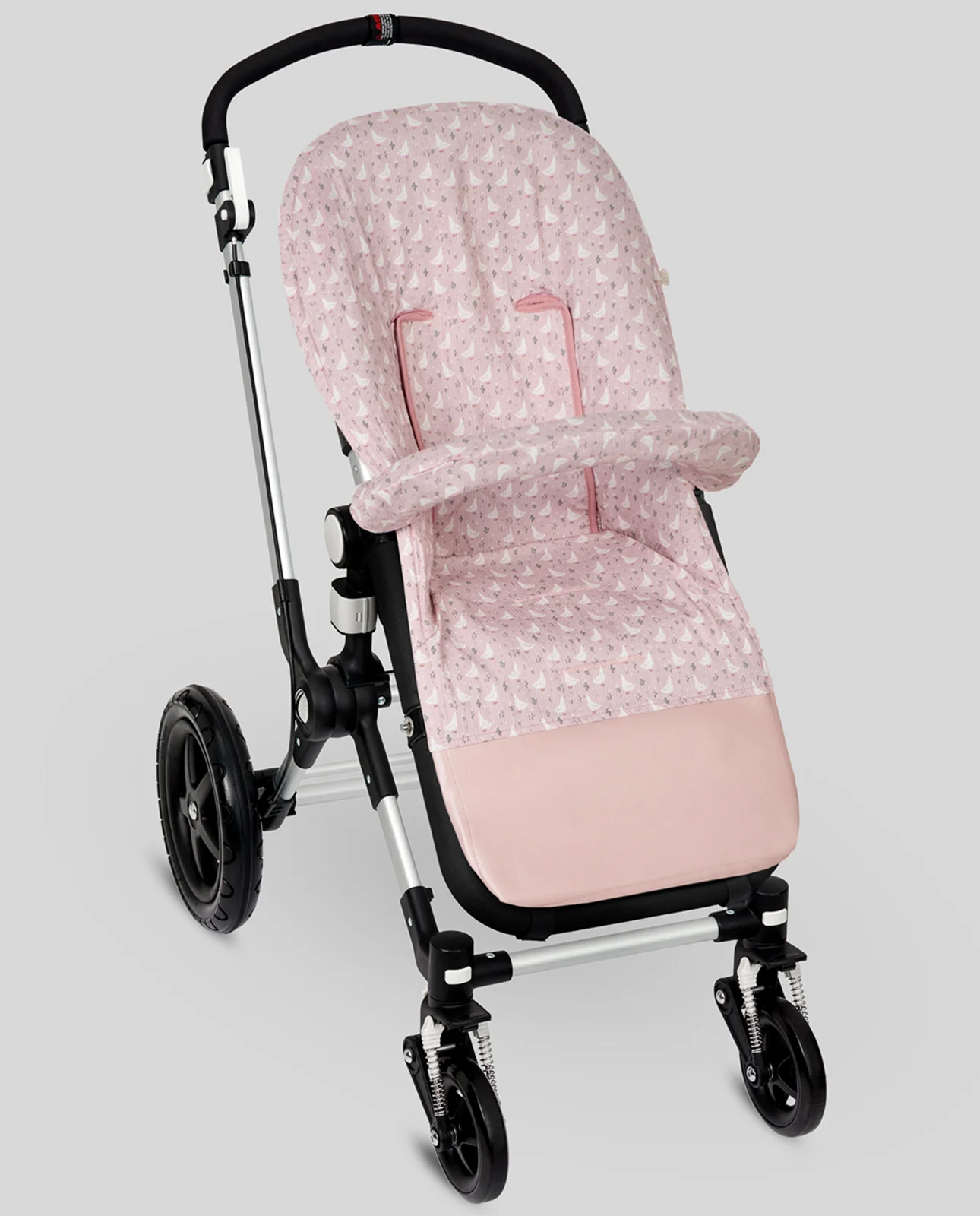 Colchoneta para sillas de paseo confeccionada en otomán estampado ocas. Cubre barra a juego y refuerzo de polipiel en los pies.