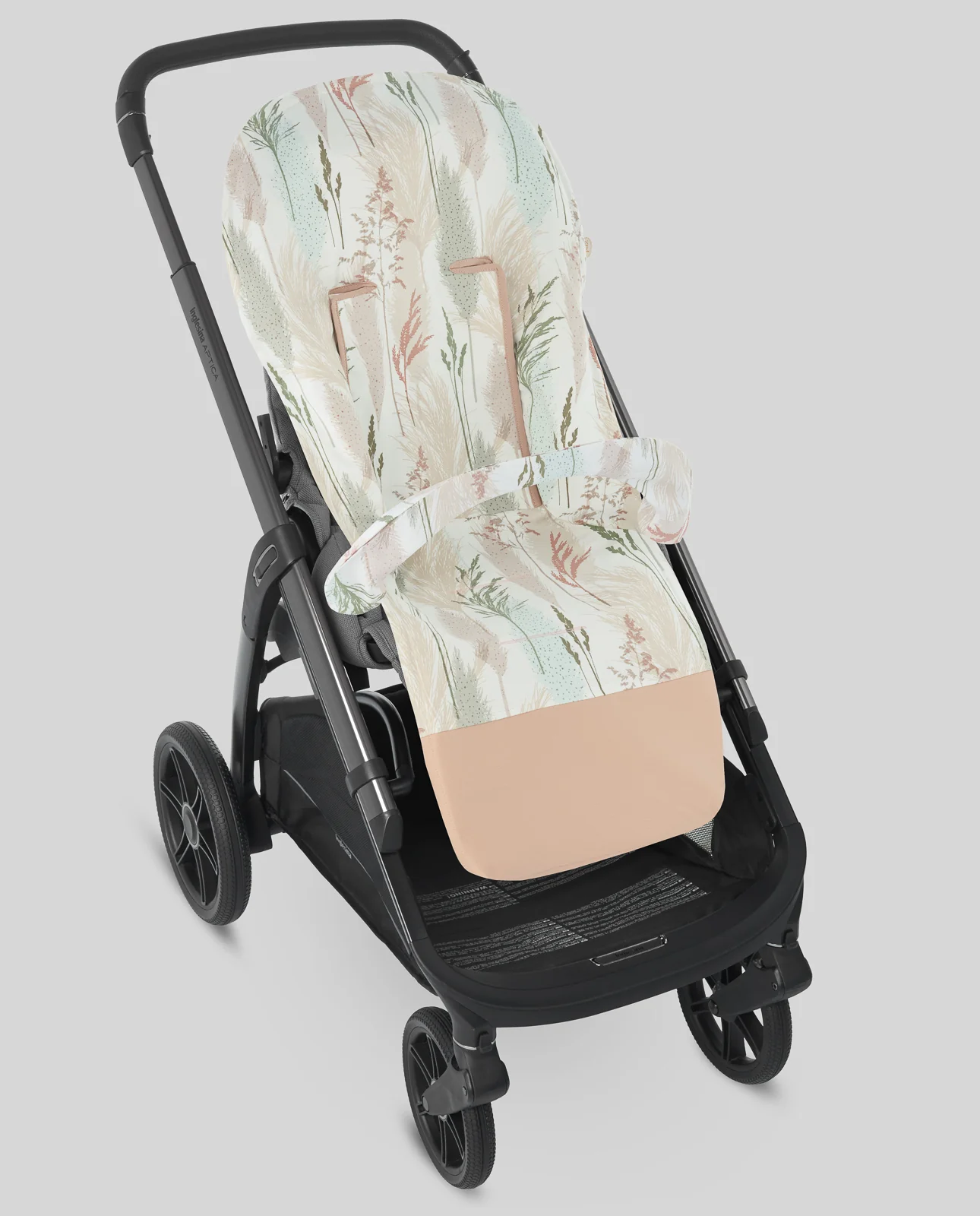 Colchoneta para sillas de paseo confeccionada en satén de estampado plumas. Cubre barra a juego y refuerzo de polipiel en los pies.
