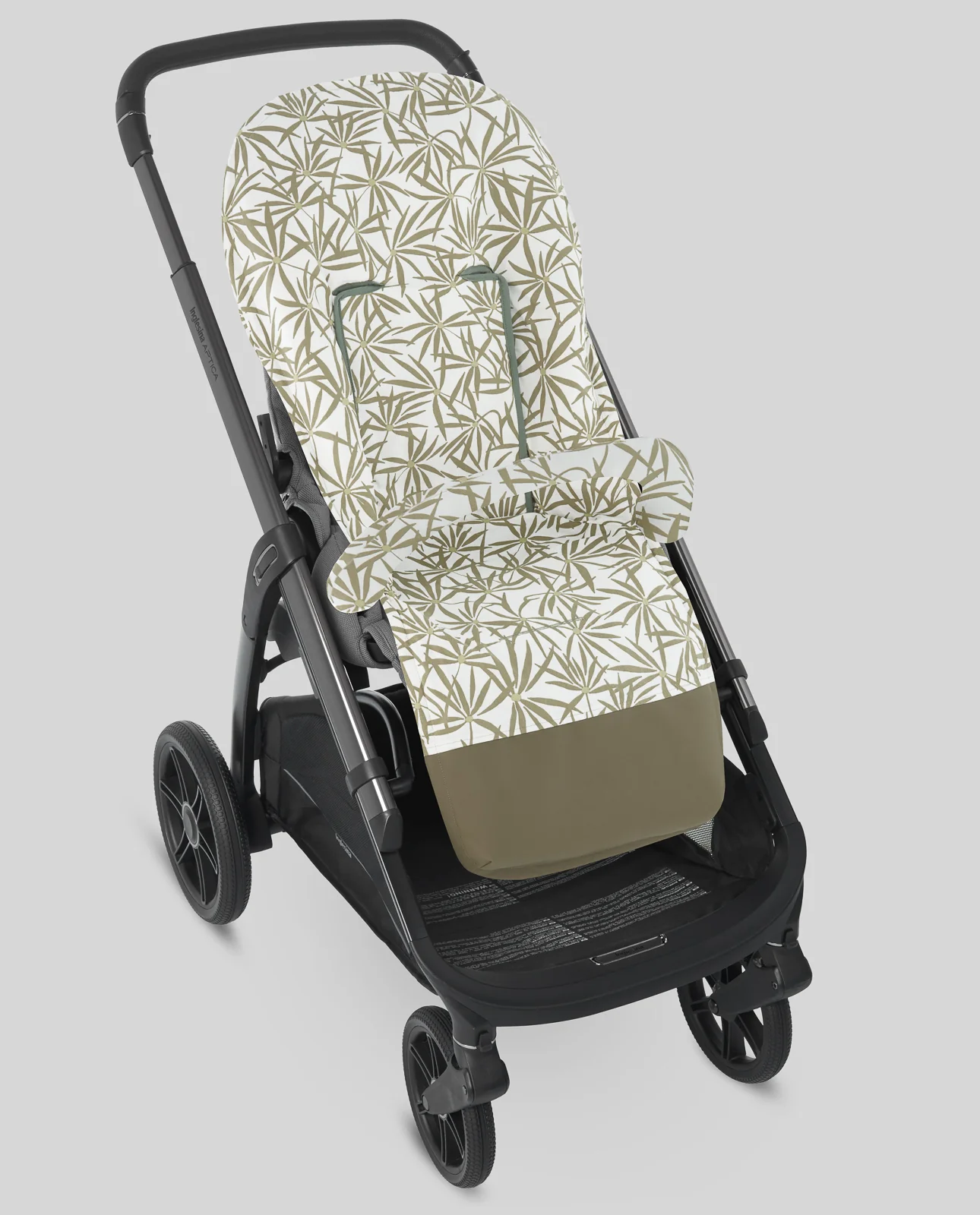 Colchoneta para sillas de paseo confeccionada en popelin con estampado vegetal. Cubre barra a juego y refuerzo de polipiel en los pies.