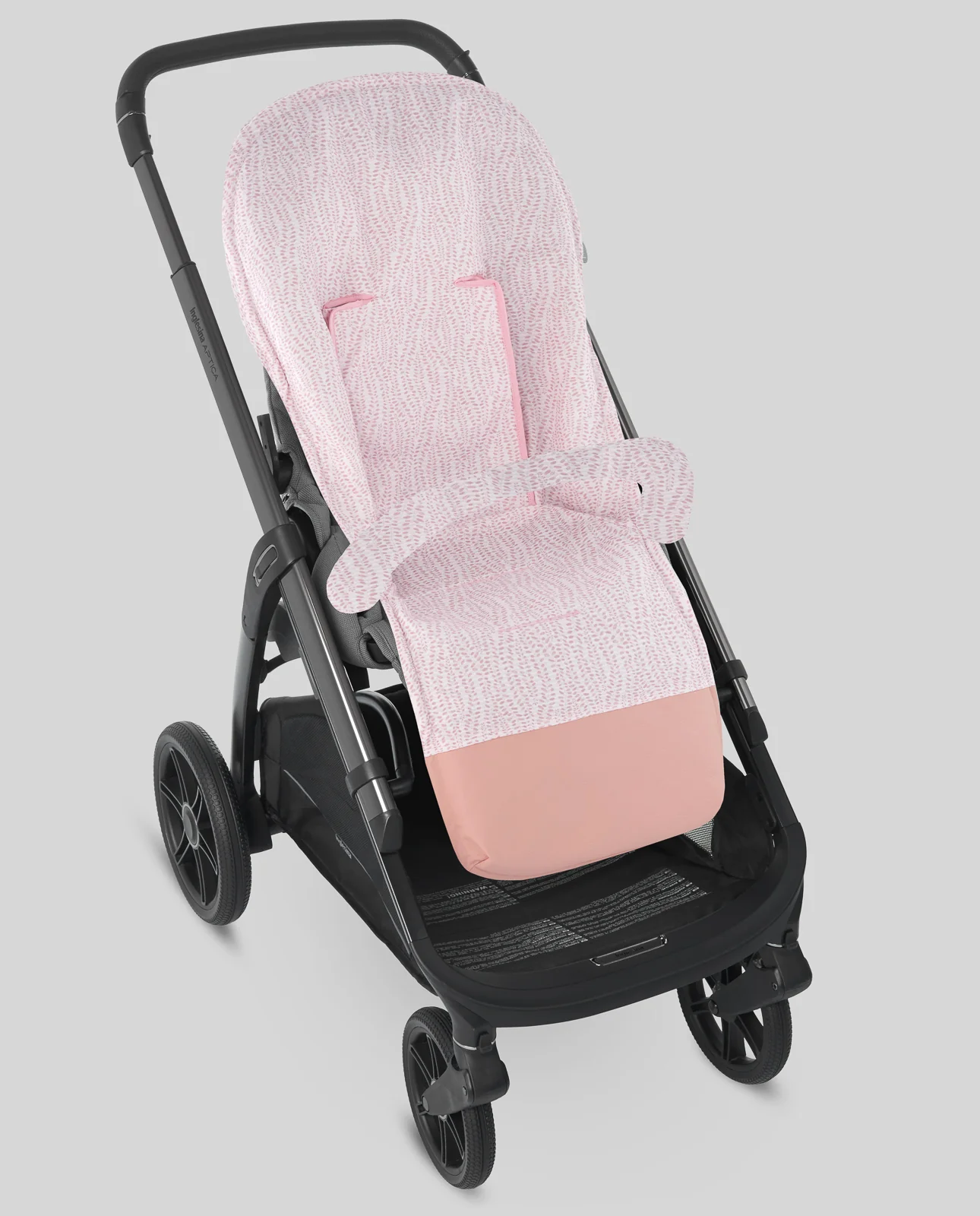 Colchoneta para sillas de paseo confeccionada en tejido piqué de algodón con estampado vegetal. Cubre barra a juego y refuerzo de polipiel en los pies.