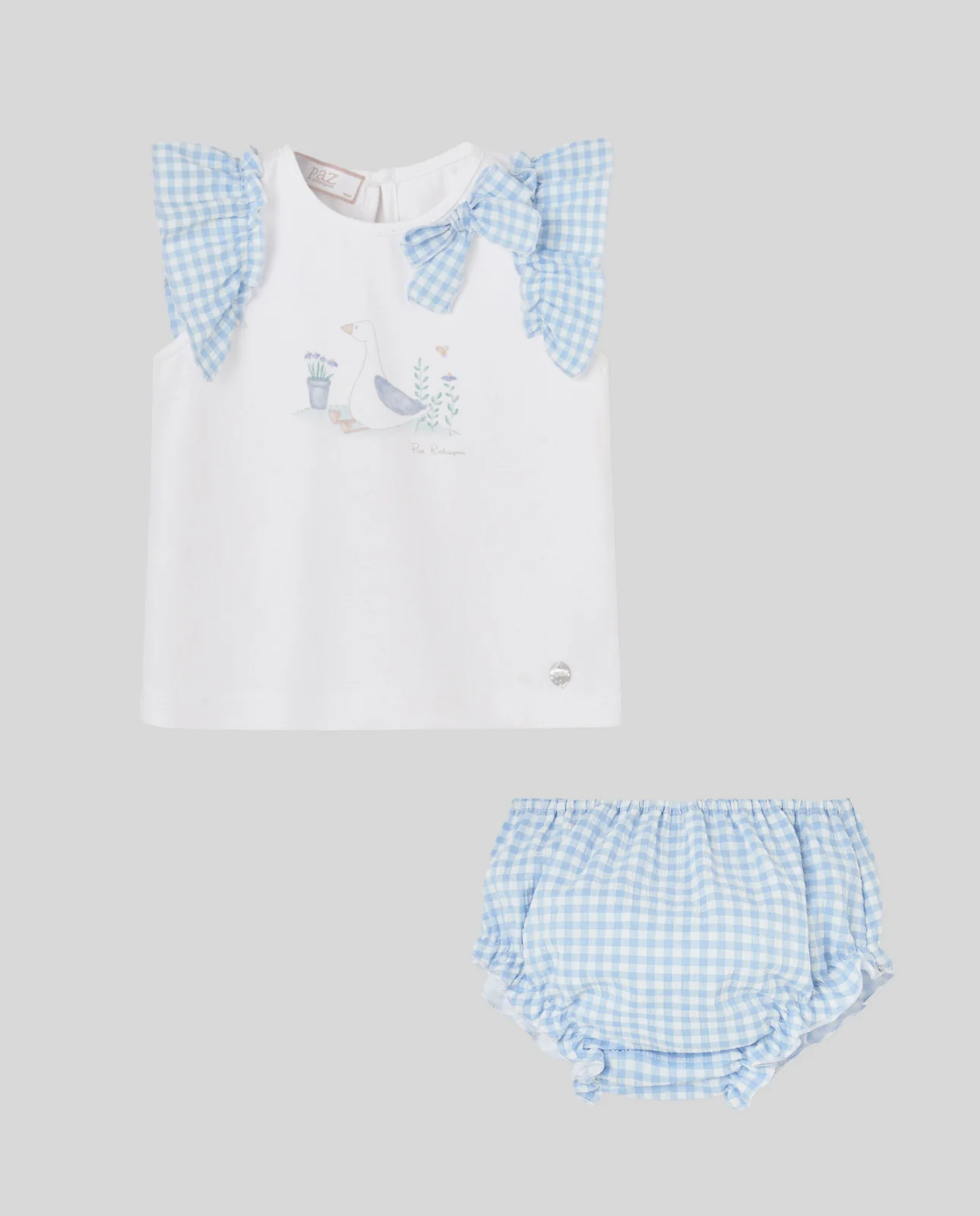 Conjunto para niña de la colección «Anade» compuesto por camiseta con estampado de oca y braguita de cuadros a juego. Confeccionado en algodón suave y transpirable, aporta dulzura y comodidad a los días de verano.