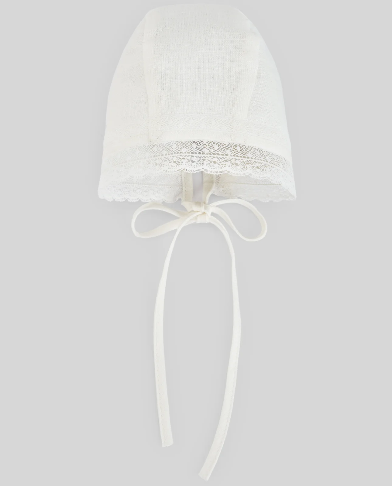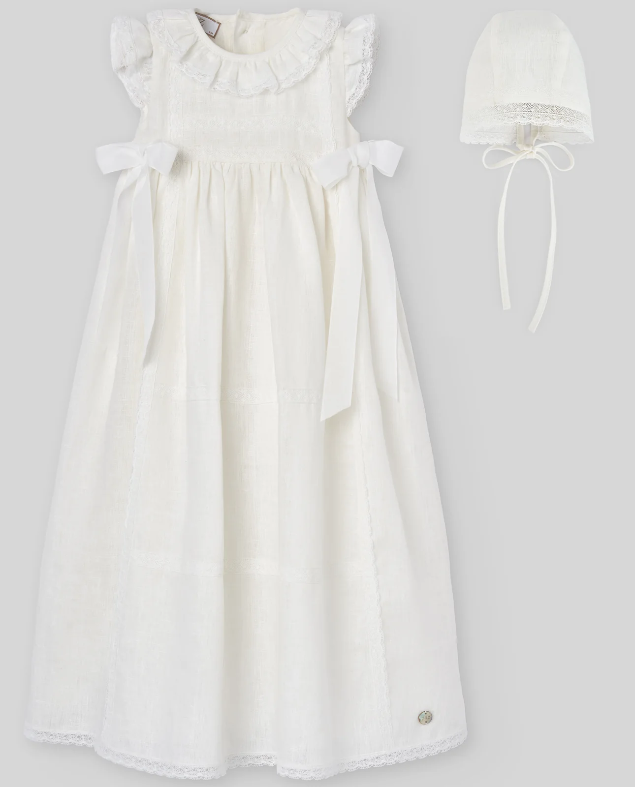 Conjunto con faldón y capota de la colección «Alegra». Confeccionado en lino con bordados sutiles y acabado artesanal, ideal para ceremonias y eventos especiales.