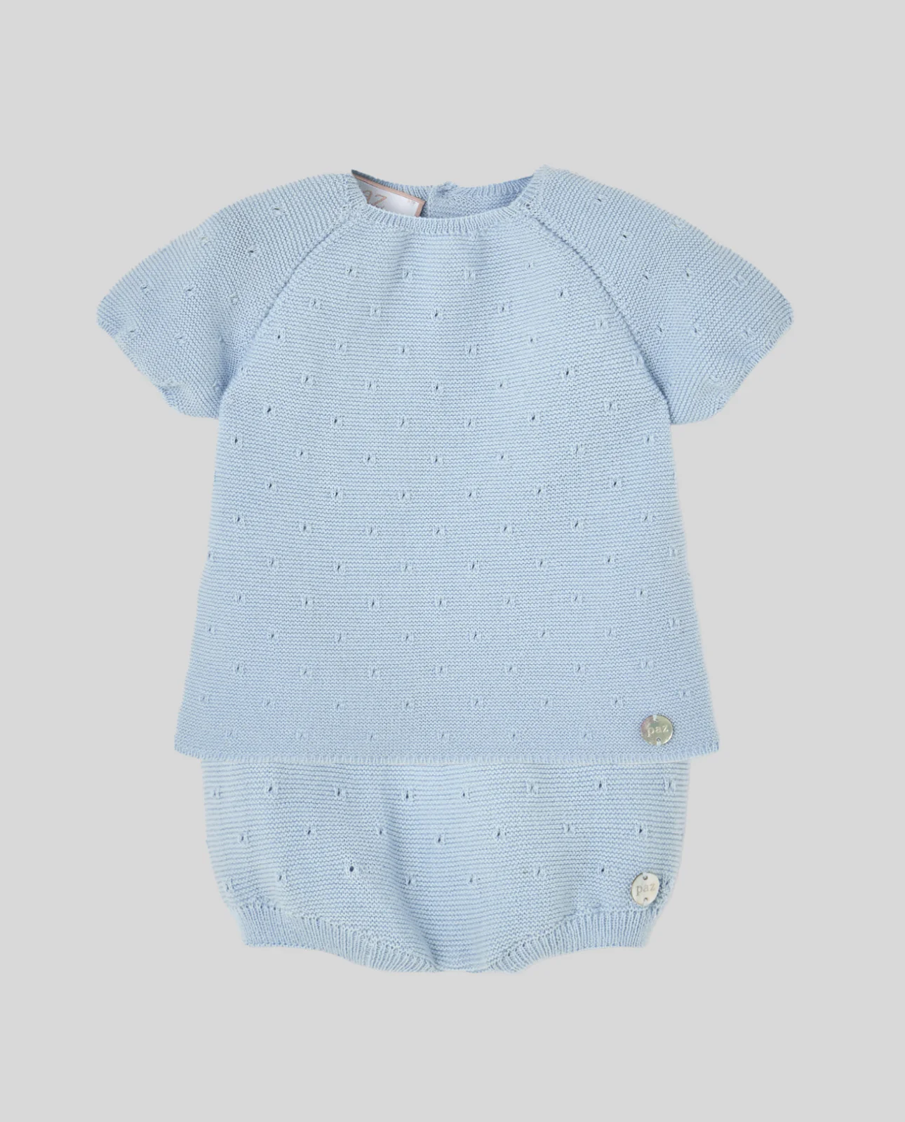Conjunto de jubón y pantalón para bebé de la colección «Essentia». Confeccionado en algodón con textura suave y corte cómodo, pensado para acompañar al bebé con estilo y ligereza en el día a día.