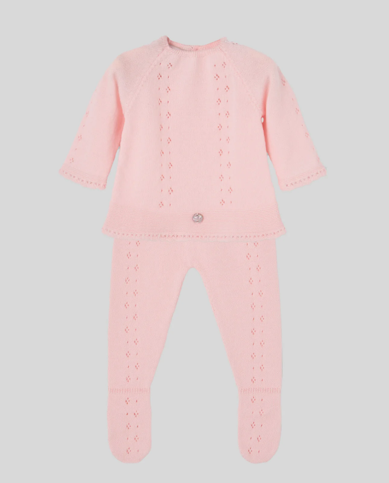 Conjunto de jubón y polaina para bebé de la colección «Essentia». Confeccionado en algodón tricotado de tacto delicado y diseño minimalista, perfecto para los primeros meses por su suavidad y calidez.