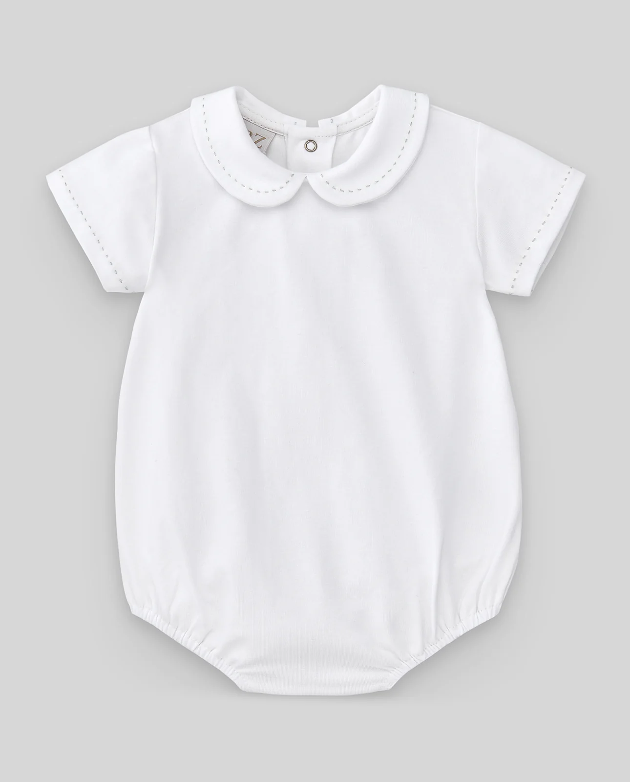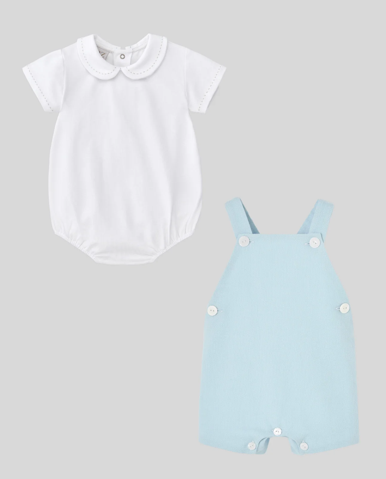 Conjunto con peto y body de la colección «Eden». En lino y algodón con bordados finos, ofrece un estilo dulce y natural para los primeros meses del bebé.