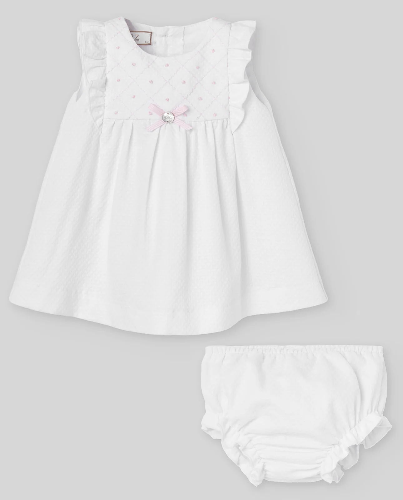 Conjunto de vestido y braga de la colección «Alaia». Realizado en lino y algodón con puntilla decorativa y diseño elegante, ideal para bautizos o ceremonias especiales.