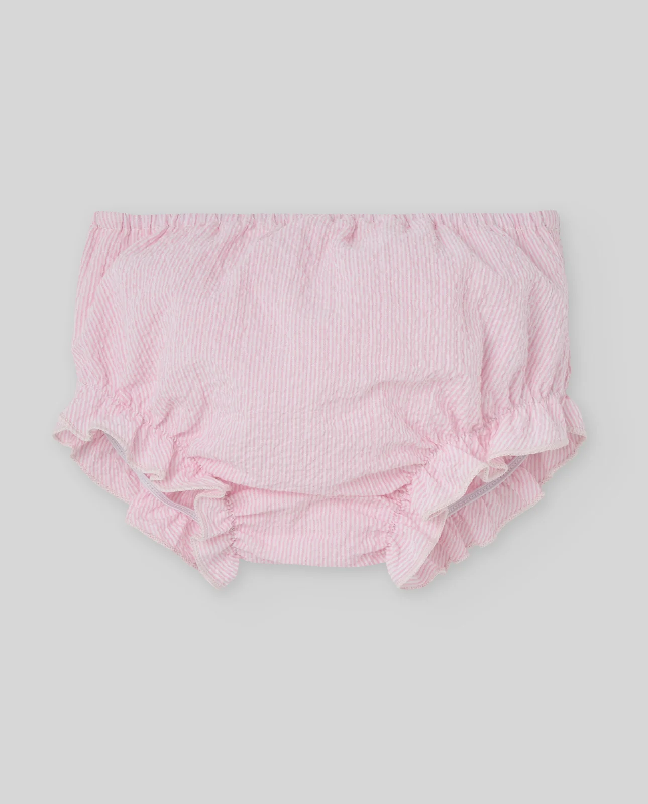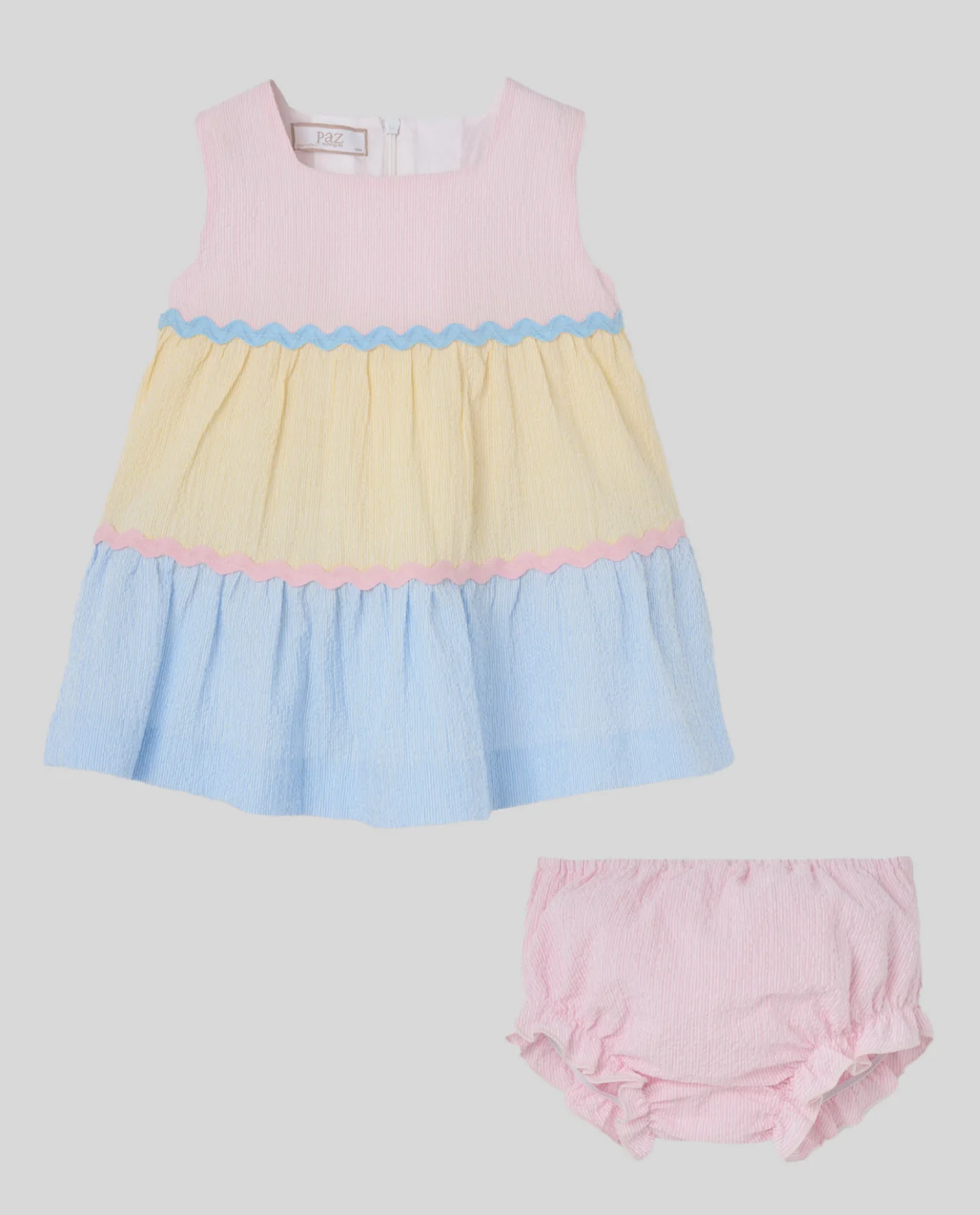 Conjunto de vestido y braguita de la colección «Candy». Diseño de rayas multicolor en seersucker con lazos decorativos, pensado para el verano y los eventos al aire libre.