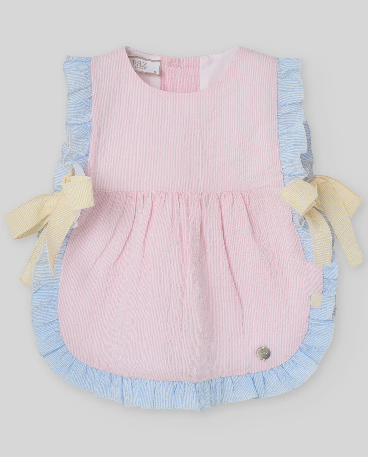 Conjunto para niña de la colección «Candy» formado por vestido corto en seersucker multicolor con braguita a juego. Su textura ligera y su diseño divertido lo hacen perfecto para el verano.