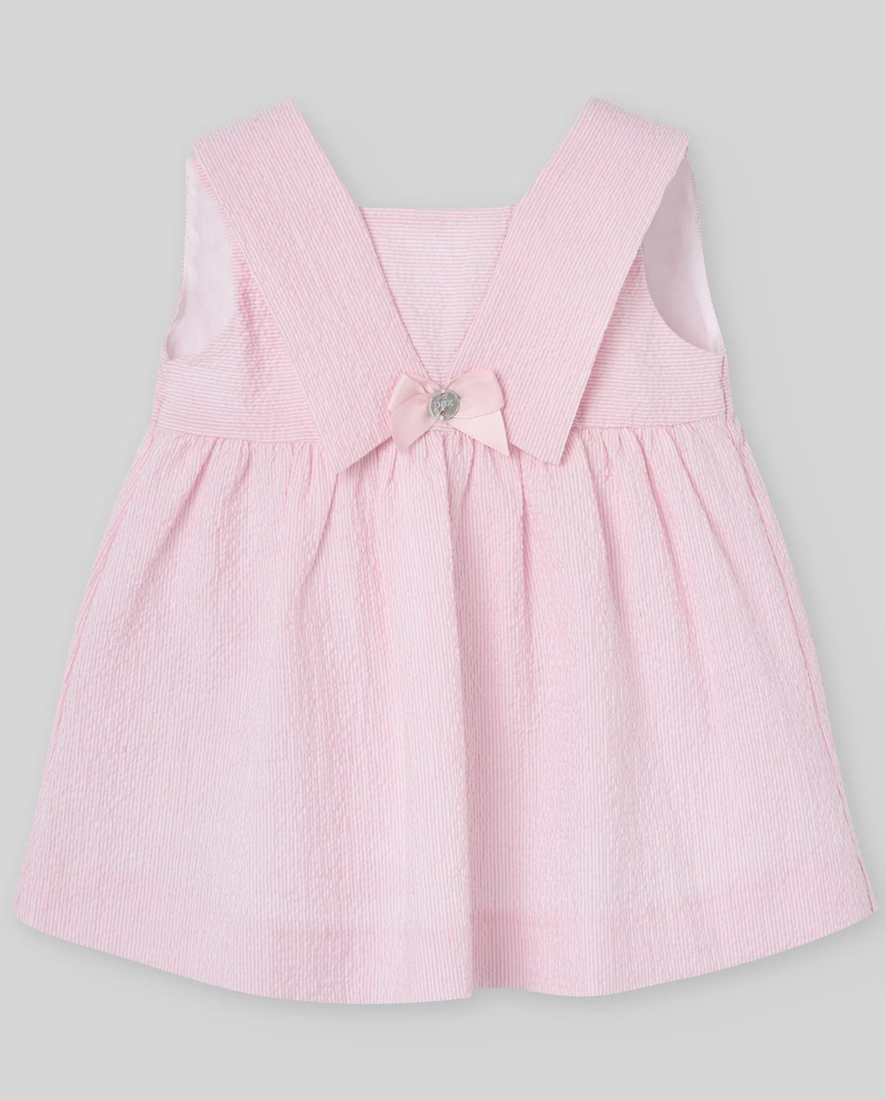 Conjunto de vestido y braguita de la colección «Candy». Confeccionado en tejido seersucker multicolor con volantes y lazos decorativos, una opción alegre y cómoda para los días más luminosos.