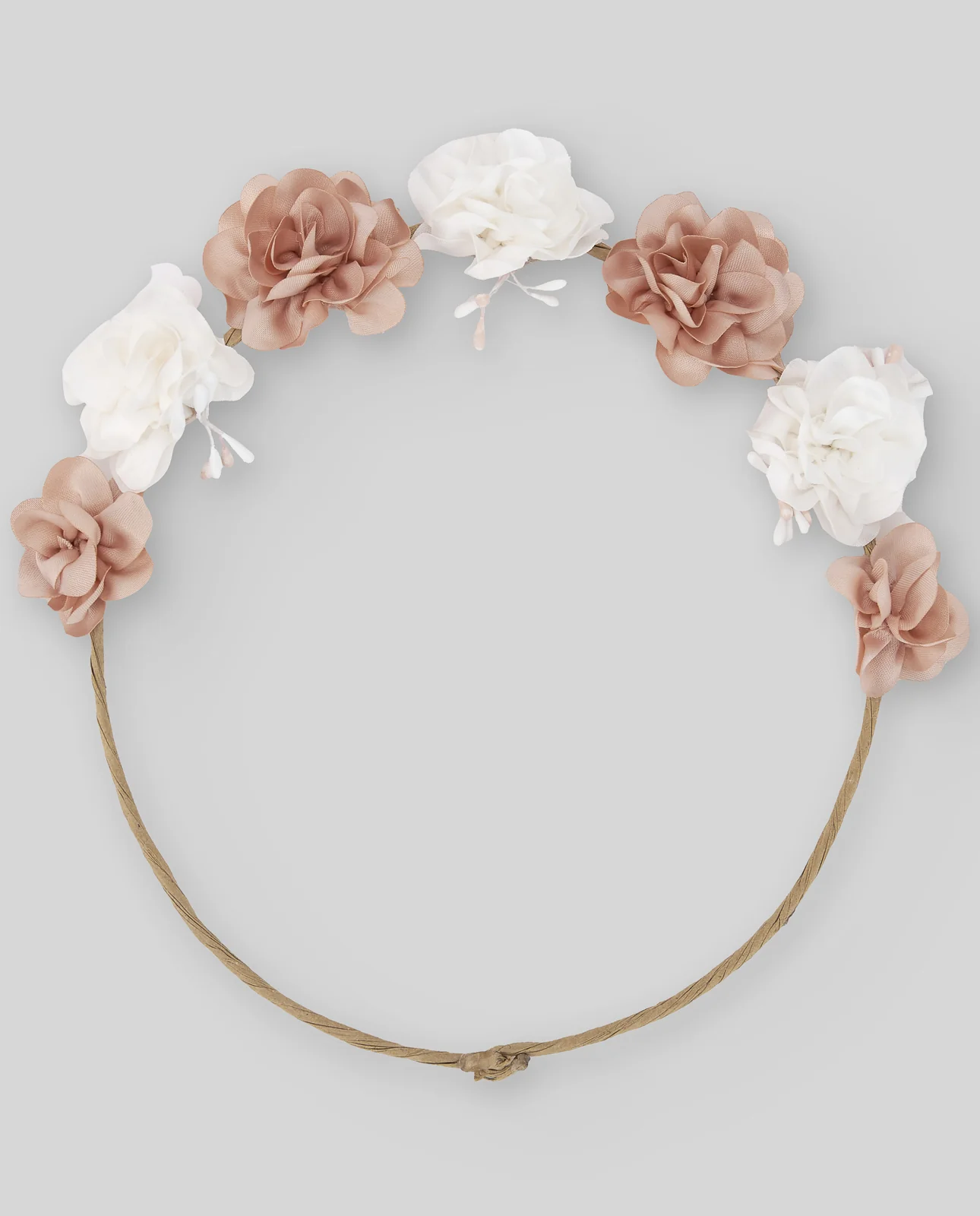 Corona decorada con flores variadas en diferentes tonos que anuda en parte trasera sobre si misma.