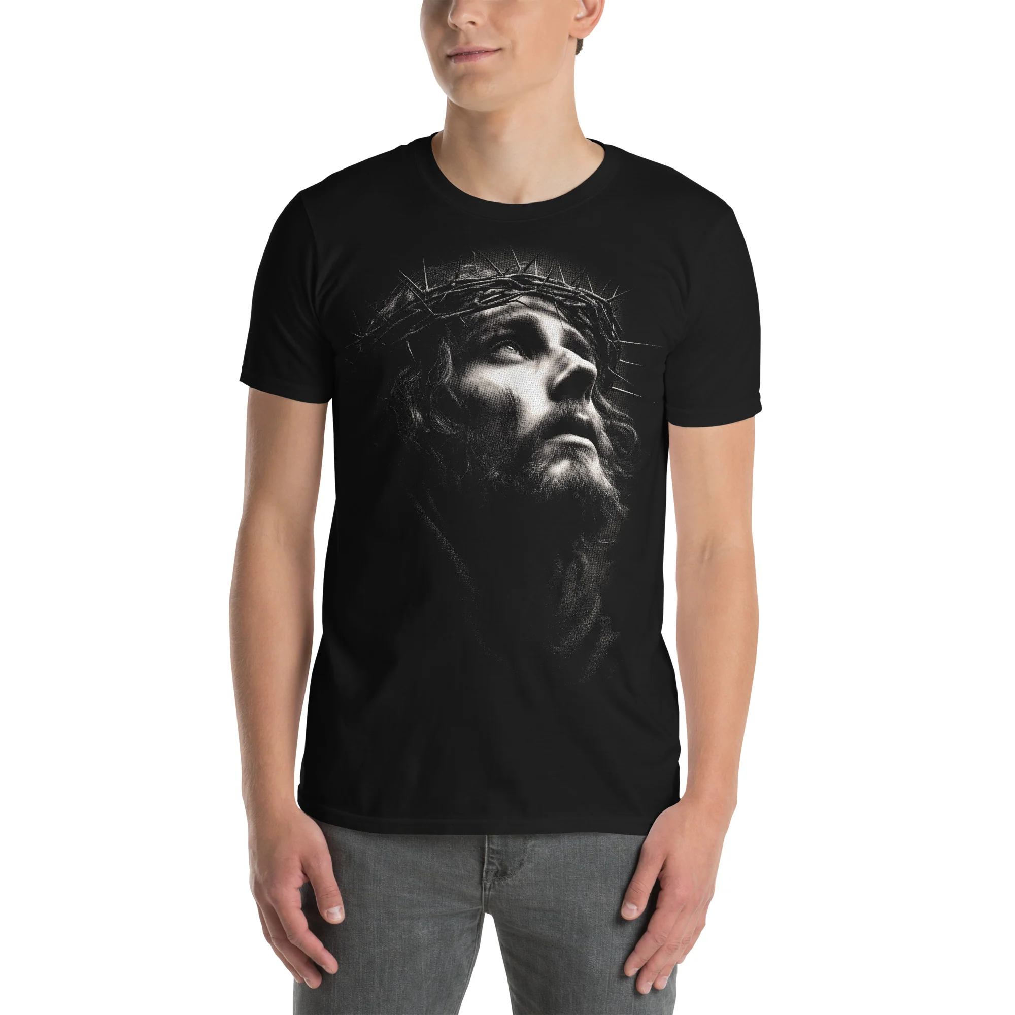 La camiseta Crown of Silence de SO Wear presenta una profunda carga simbólica y emocional. Un diseño con un retrato hiperrealista de Jesús con corona de espinas, mirada elevada y gesto contenido, transmitiendo una sensación de sacrificio, introspección y fuerza interior.