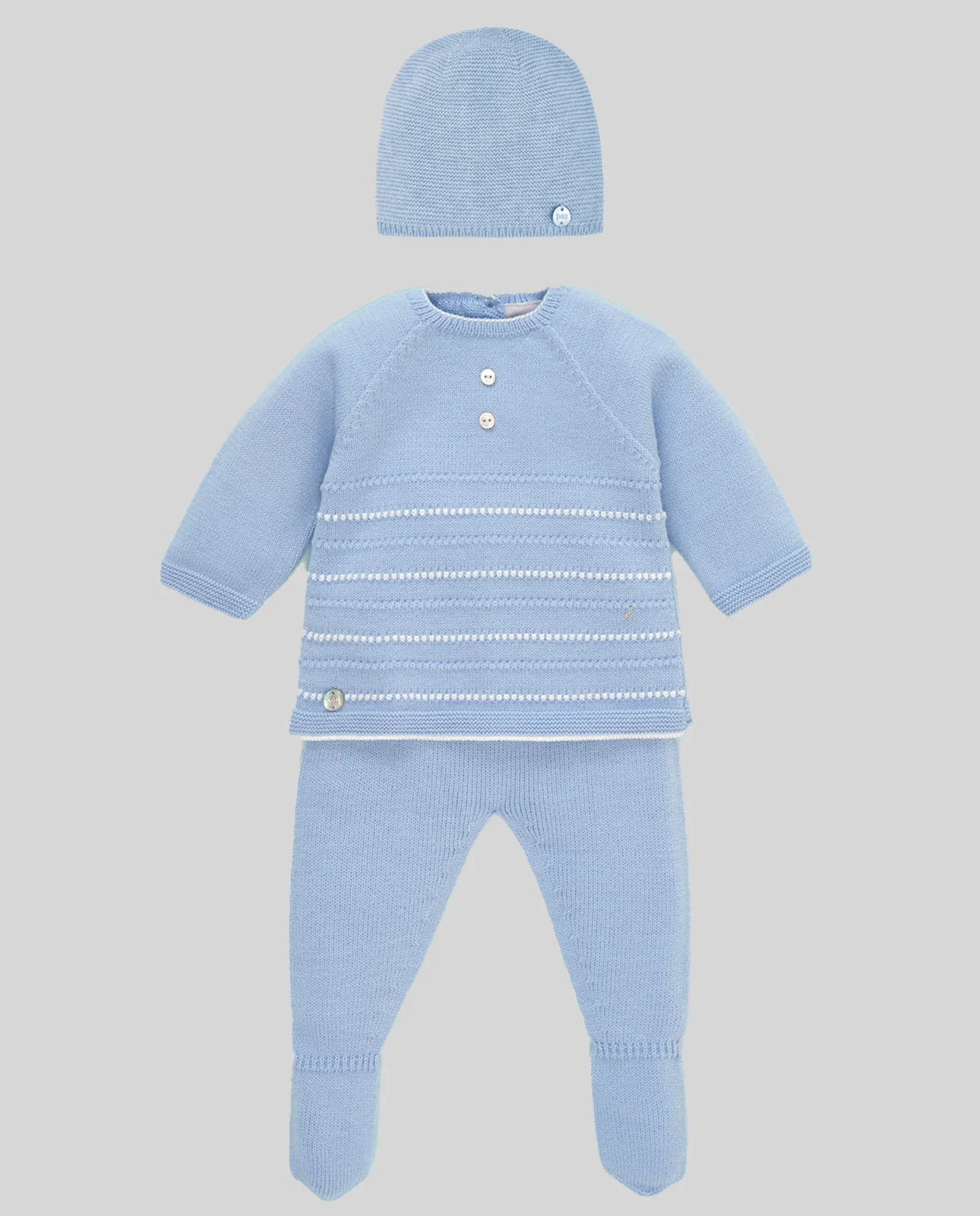 Conjunto de jubón con detalles de bodoques, polaina y gorro coordinado. Su composición de 95% algodón y 5% cachemira aporta confort y suavidad en un diseño ideal para regalar.
