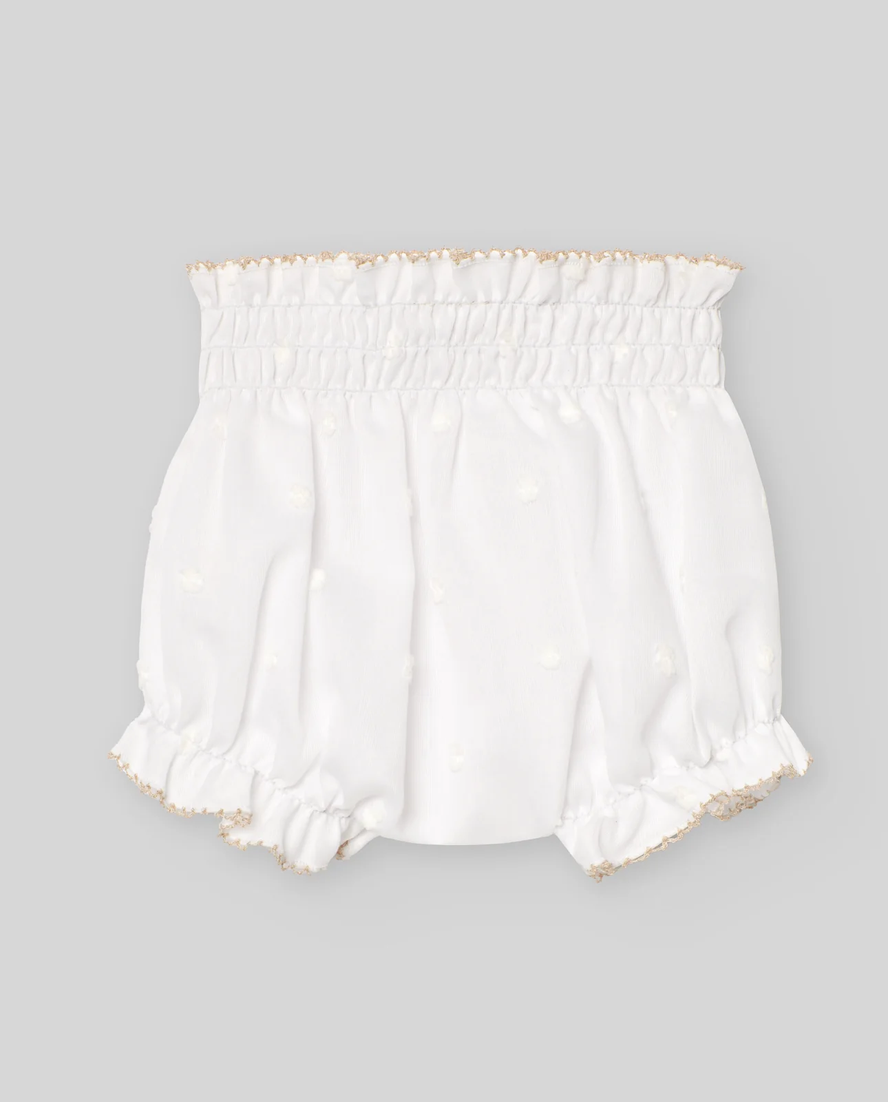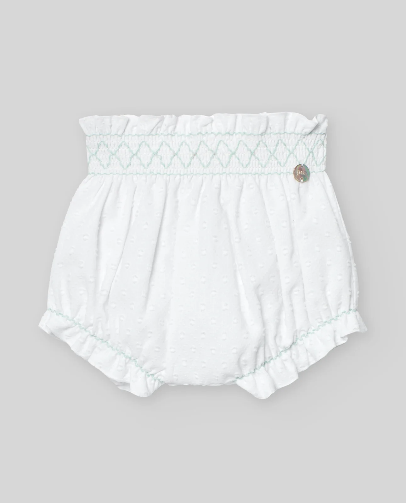 Cubrepañal en tejido tipo plumetti geométrico con nido de abeja a contraste en cintura y piernas.