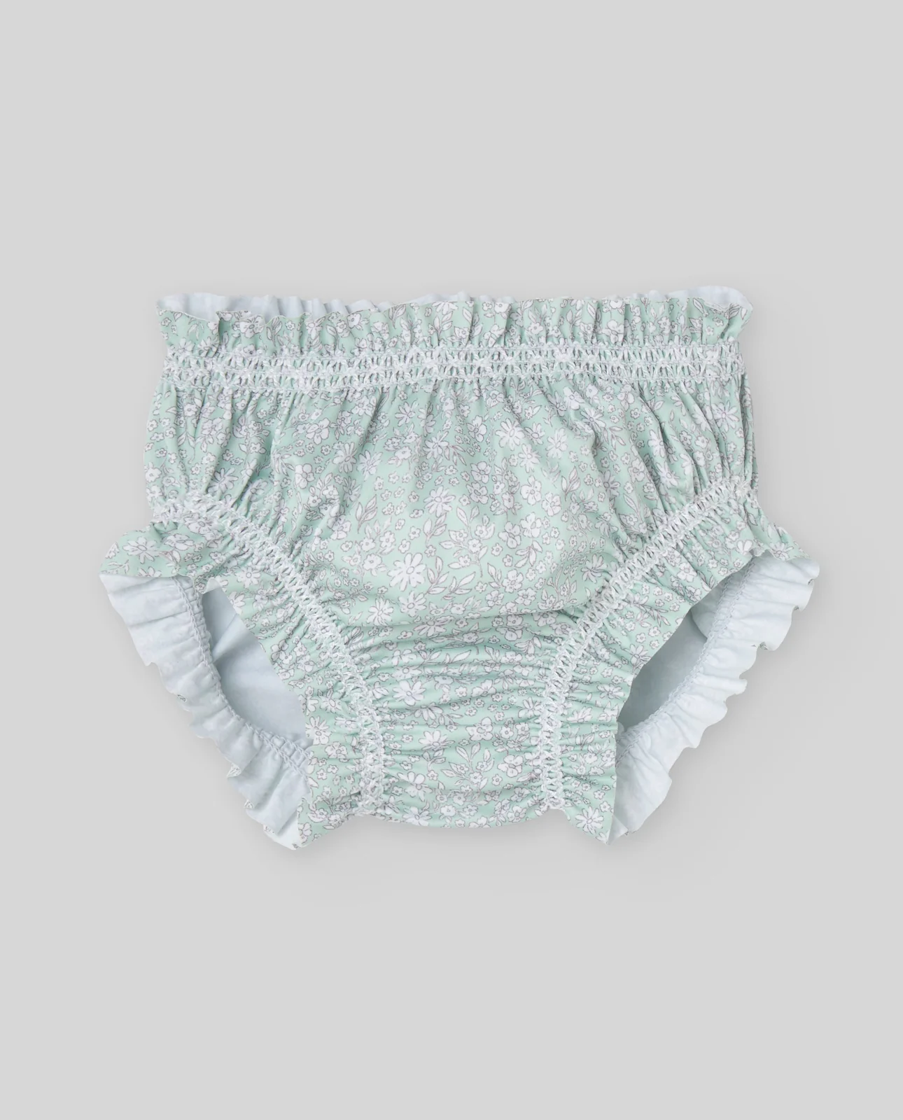 Cubrepañal de la colección «Baño» con estampado floral. Con detalles fruncidos y volante en la cintura, está confeccionado en tejido con protección solar UPF +50, ideal para los primeros baños del bebé.