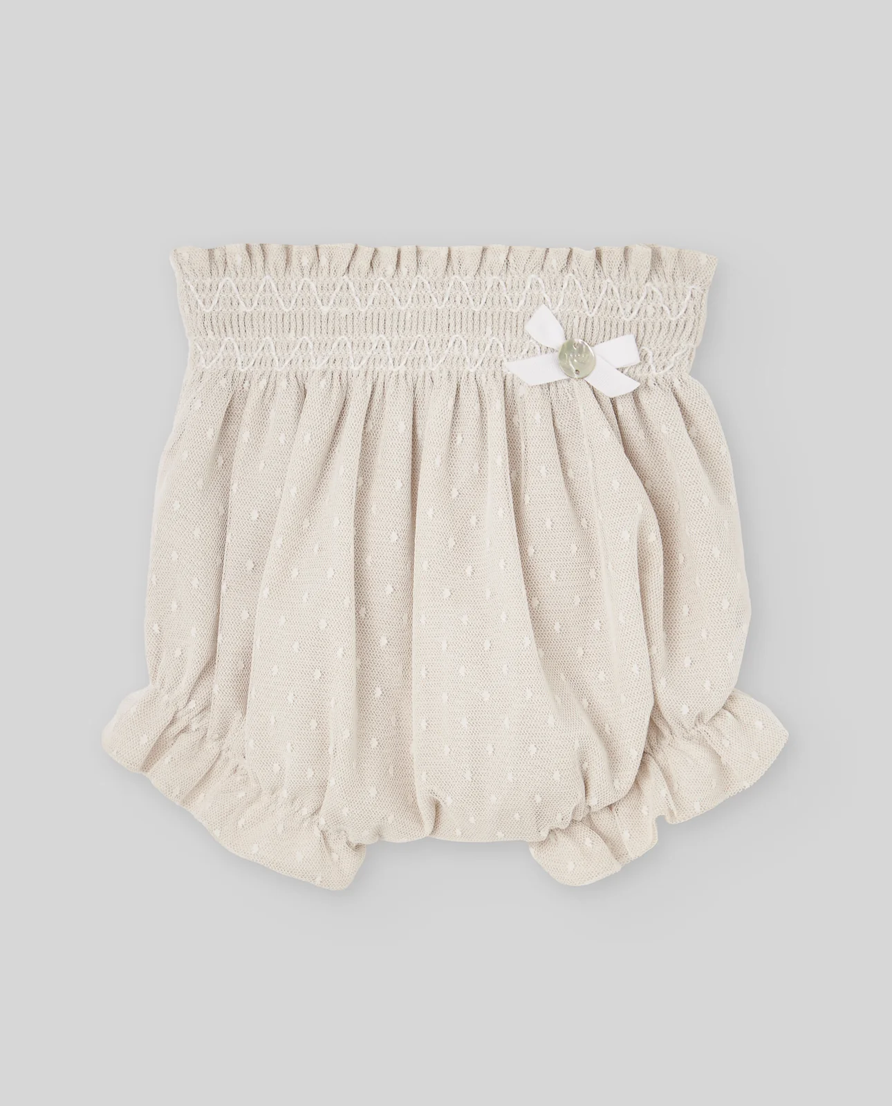 Cubrepañal de tul plumeti con cintura elástica y lazo decorativo, diseñado para combinar con prendas de la colección «Nectar».