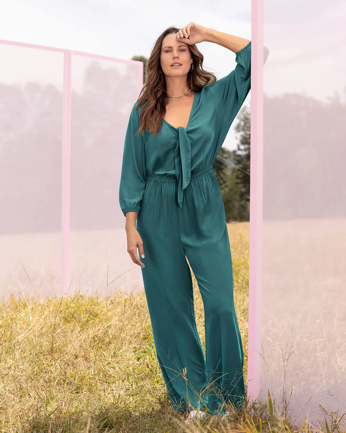 ¡El enterizo largo escote en V que lo tiene todo! Elegante y versátil, esta prenda es perfecta para cualquier ocasión. Su escote en V con tiras para anudar al frente, le da un toque femenino y único, mientras que el elástico en cintura enmarca tu figura y te hace lucir muy bien. Complementa tu look con tus accesorios favoritos y una chaqueta en denim para un toque casual o un blazer para un look más formal.