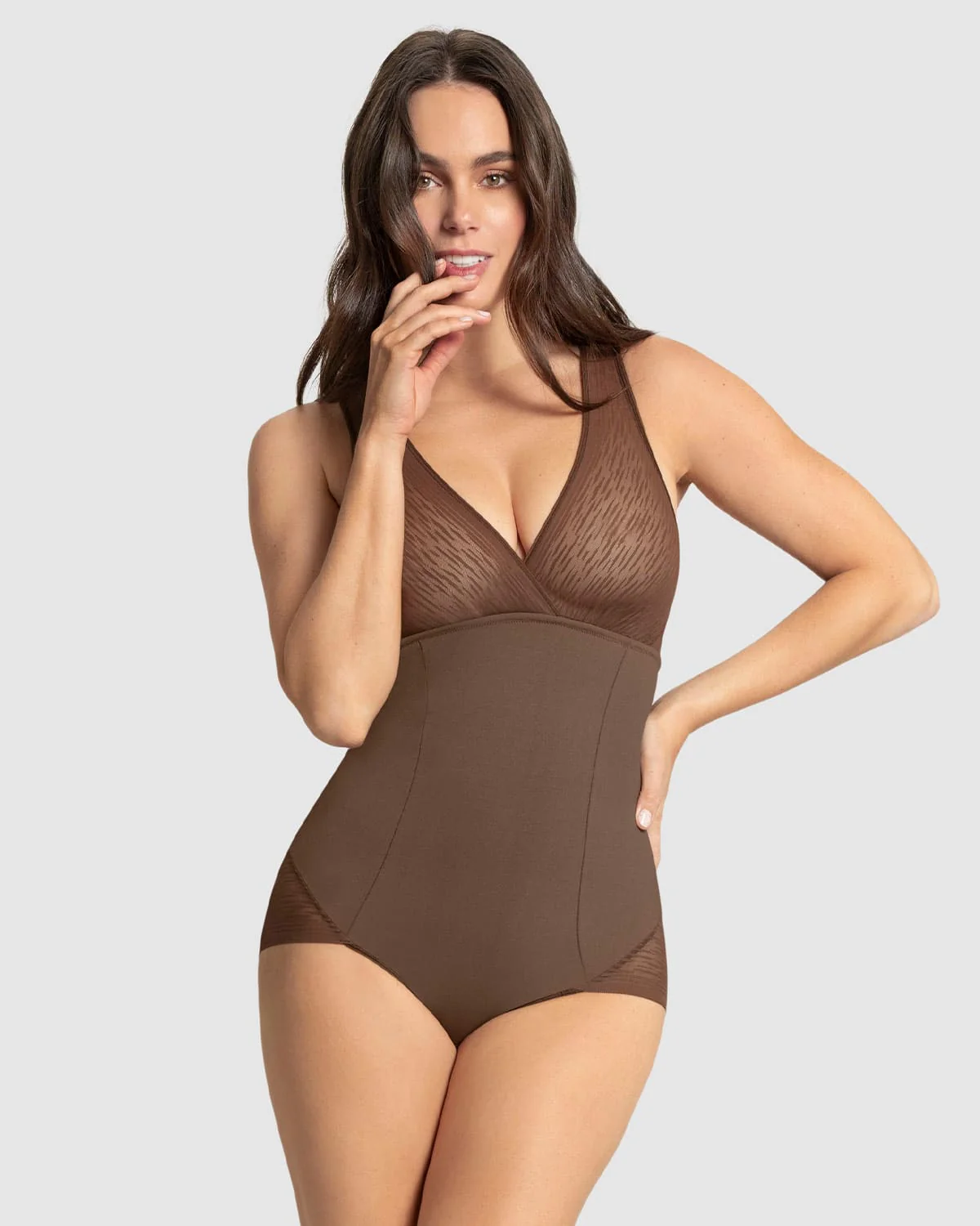 Este body faja cuenta con control de abdomen para estilizar más tu figura y con bralette incorporado para que tengas todo en 1 sola prenda. El bralette tiene un forro interno en las copas para evitar que se formen transparencias y brinda muy buen cubrimiento en los laterales de la sisa para disimular los rollitos de esta zona. En el abdomen y la espalda está elaborado con doble capa de tela lisa + PowerSlim, nuestro material de compresión, y cuenta con cortes frontales que dan un efecto de cintura reloj de arena. El refuerzo en los laterales del busto lo centrará más y el elástico en la base te dará mayor soporte. El tul en los laterales de las piernas y los glúteos le da un toque femenino y sexy a la faja, y además, es de efecto invisible ya que el panty no tiene elásticos. Un beneficio más: te encantará saber que la costura en el centro de los glúteos les dará una modelación más redondeada.