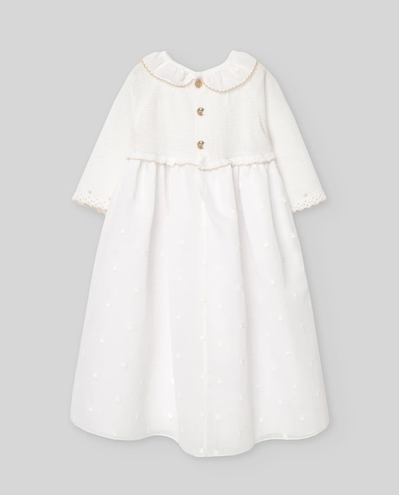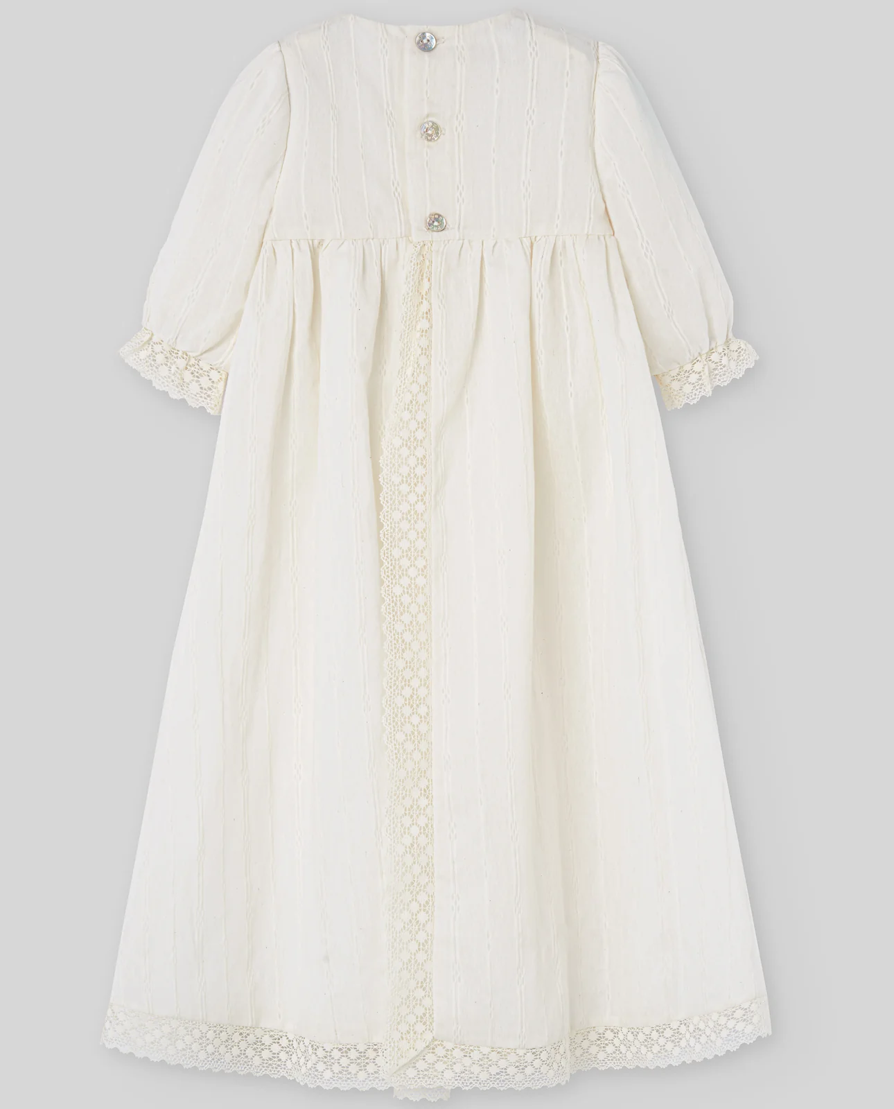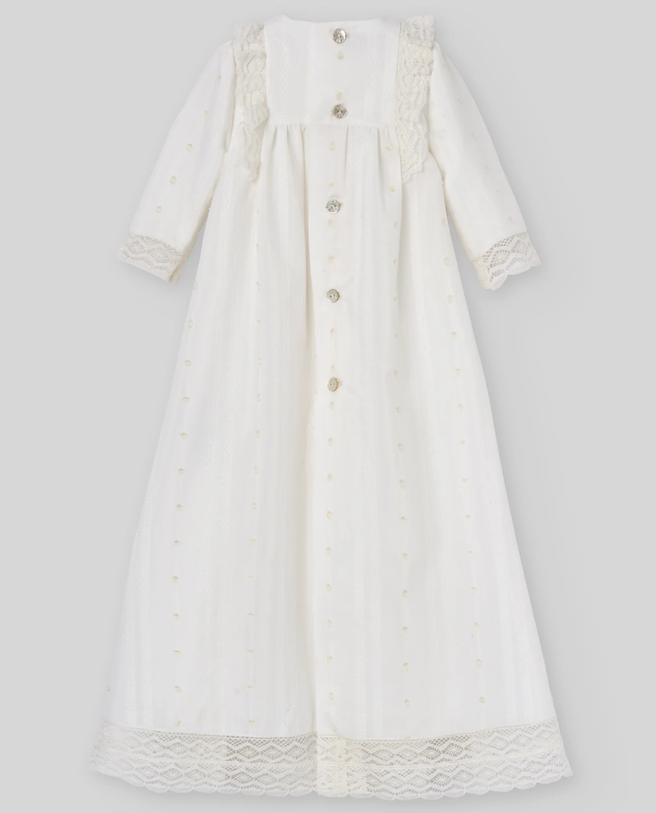 Faldón largo de muselina con delicado dibujo plumeti, ideal para bautizos y ocasiones especiales. Adornado con encajes artesanales en el delantero, mangas y bajo. Lazada central en tono a juego que aporta elegancia. Cierre trasero con botones nacarados.