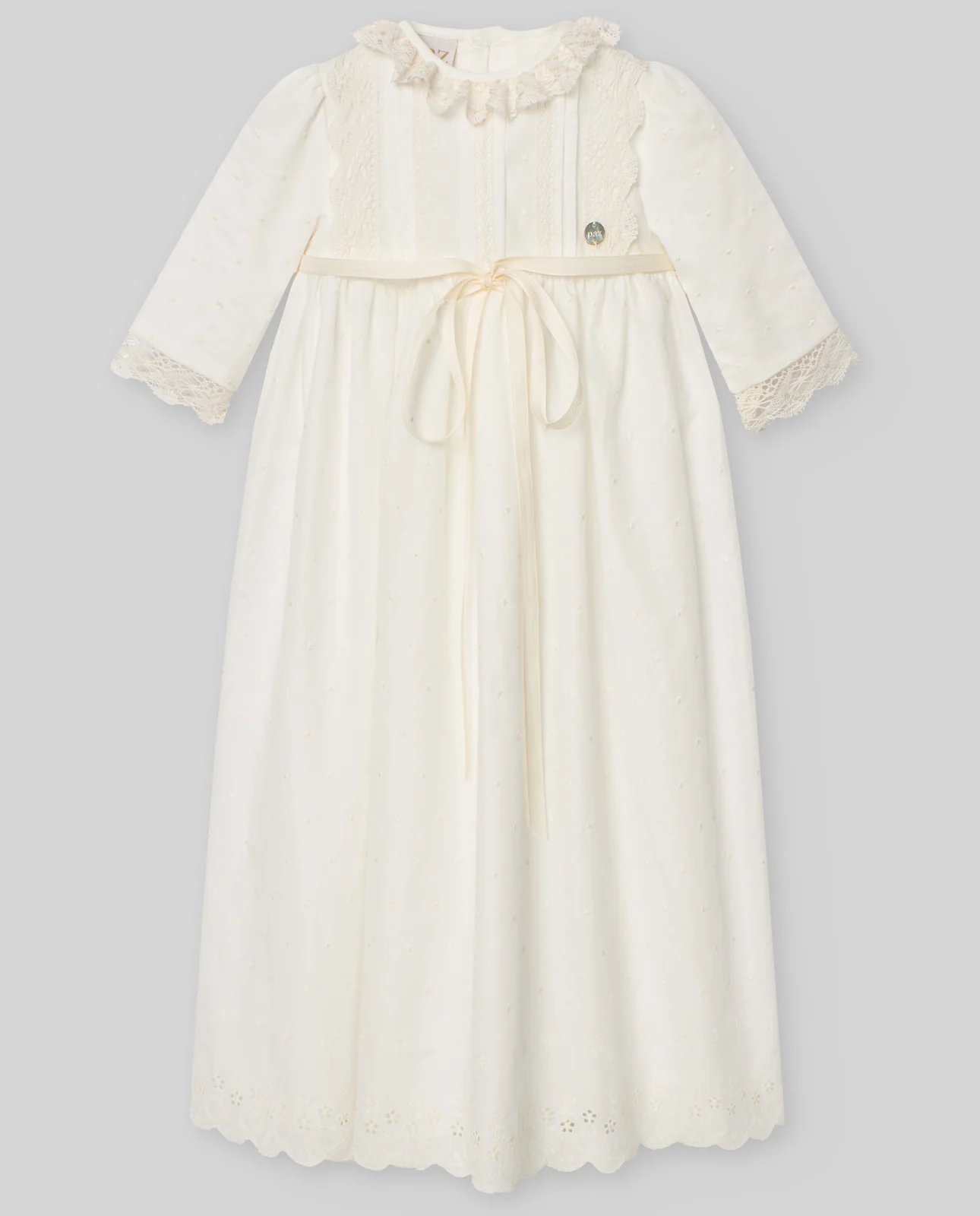 Espectacular faldón o vestido largo para bautizo y ocasiones especiales. Con mangas largas y cuello redondo, es la opción perfecta para tu bebé. Detalles delicados de puntillas fruncidas en el cuello y las mangas, y un tejido de bodoques bordados que aporta un toque elegante. El diseño presenta detalles elaborados en el pecho y una elegante lazada central con un gran lazo de raso a tono. Cierre trasero con botones para mayor comodidad. Bajo rematado en ondas con ligeros calados imitando flores.