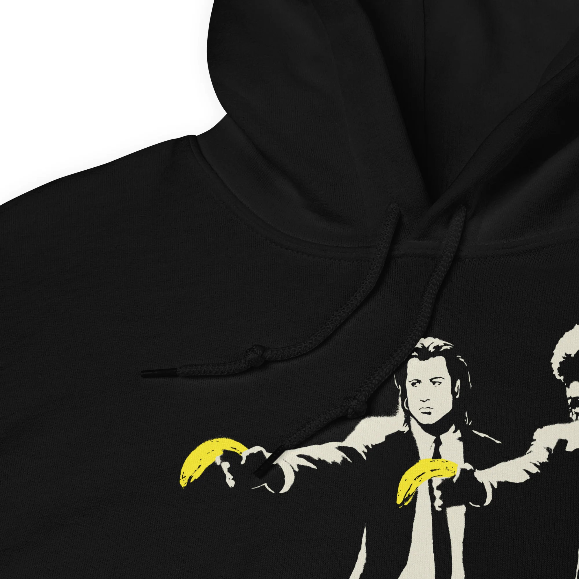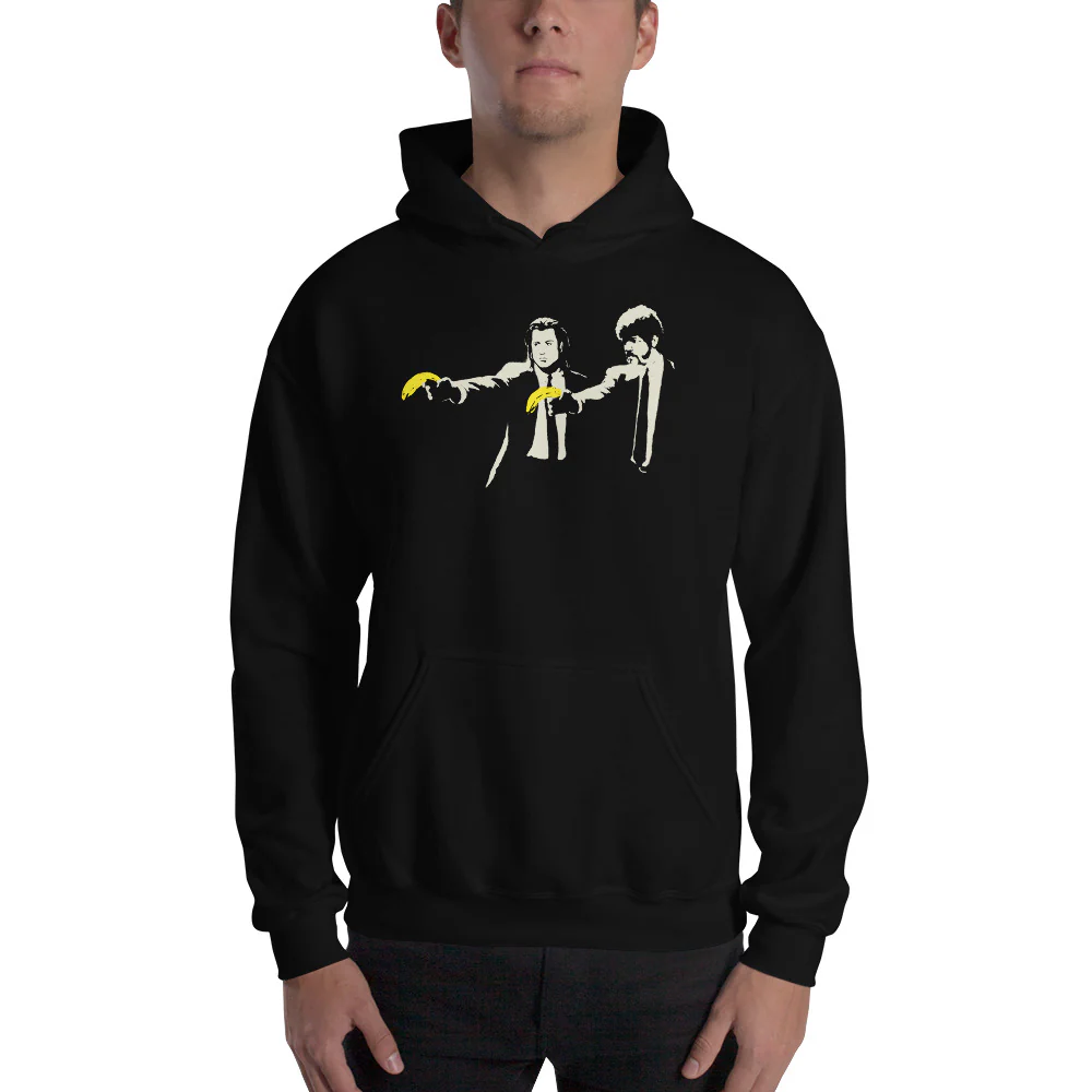 Obra urbana con la famosa imagen de los gangsters Vincent Vega y Jules Winnfield pero cambiando las pistolas por plátanos.