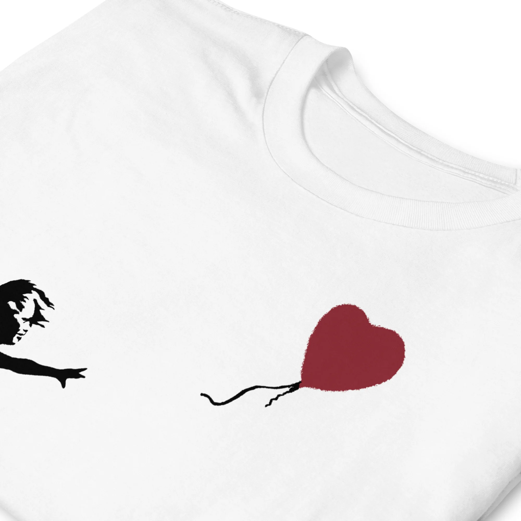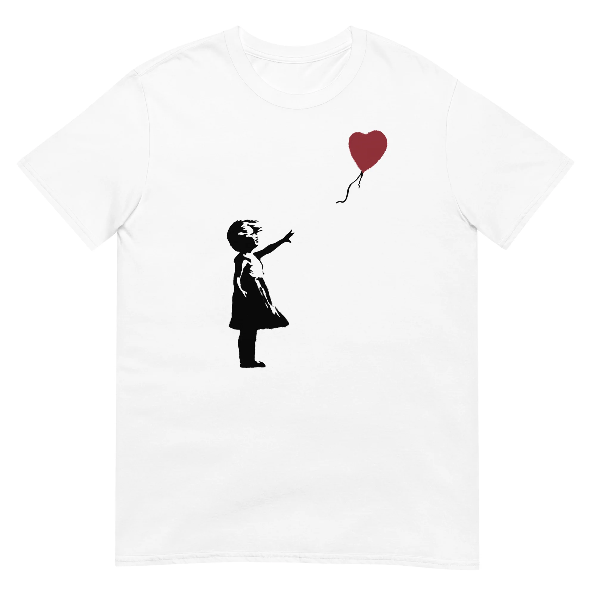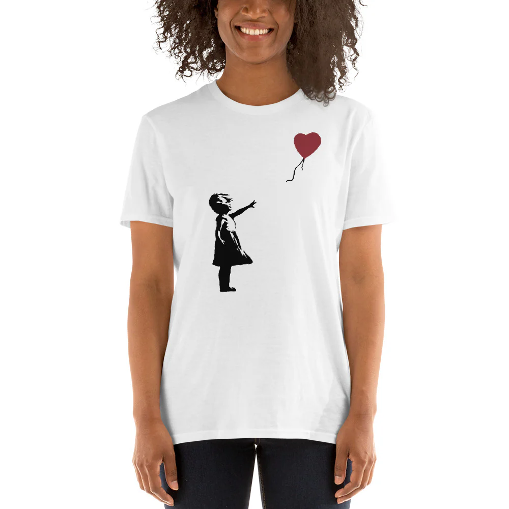 Camiseta de la obra de arte Girl with Balloon de Banksy. Es una de las imágenes más icónicas del siglo XXI, cargada de interpretaciones emotivas (algunos ven a la niña perdiendo el globo, mientras que otros la ven a punto de atraparlo) es una alegoría de la esperanza, el amor y la libertad.