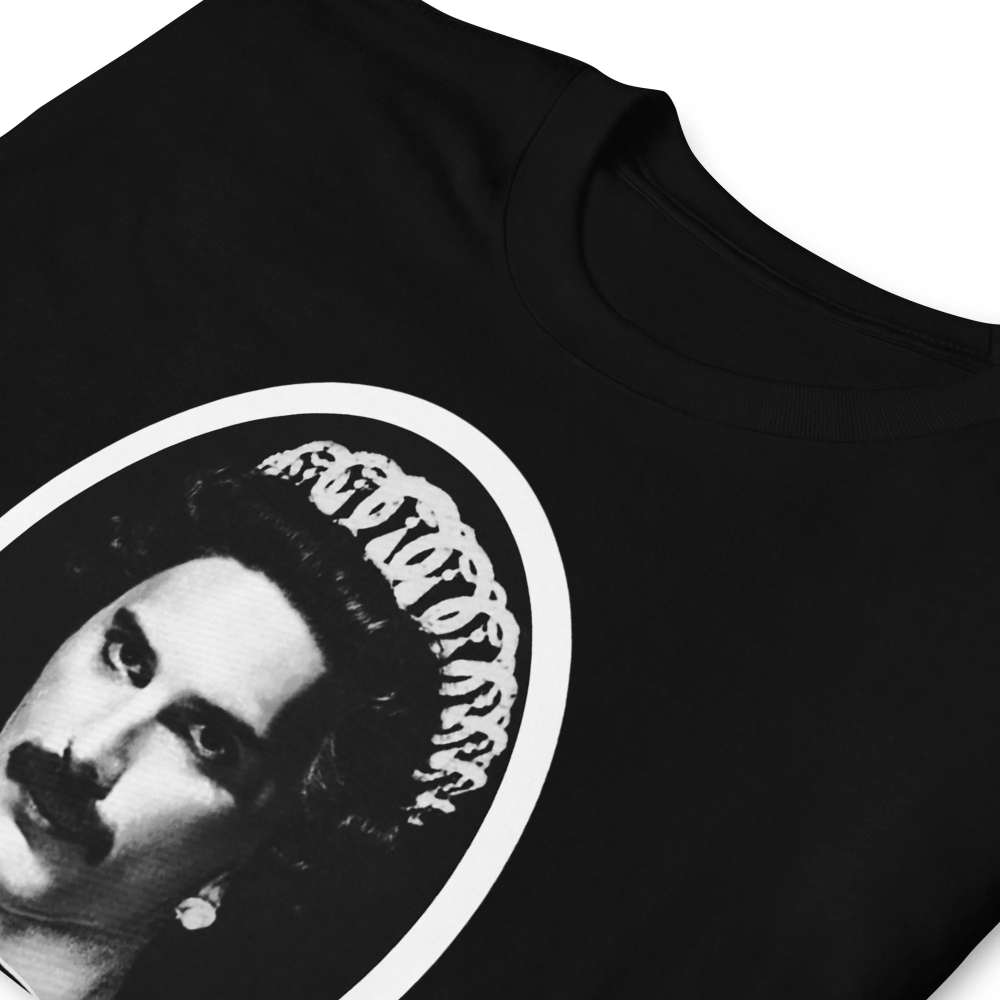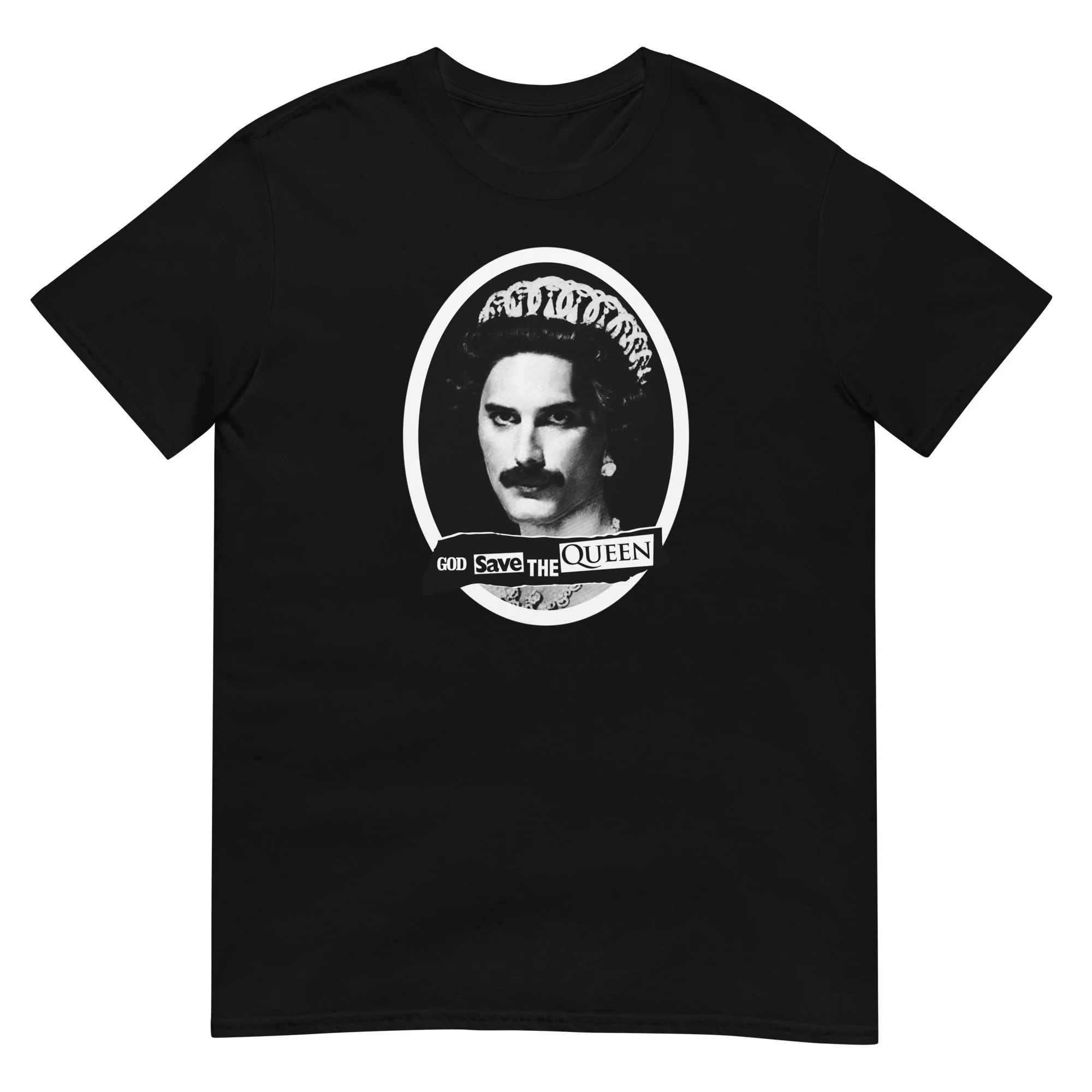 Divertida camiseta que combina la canción God Save the Queen de Sex Pistols con Freddie Mercury el líder de la banda Queen.